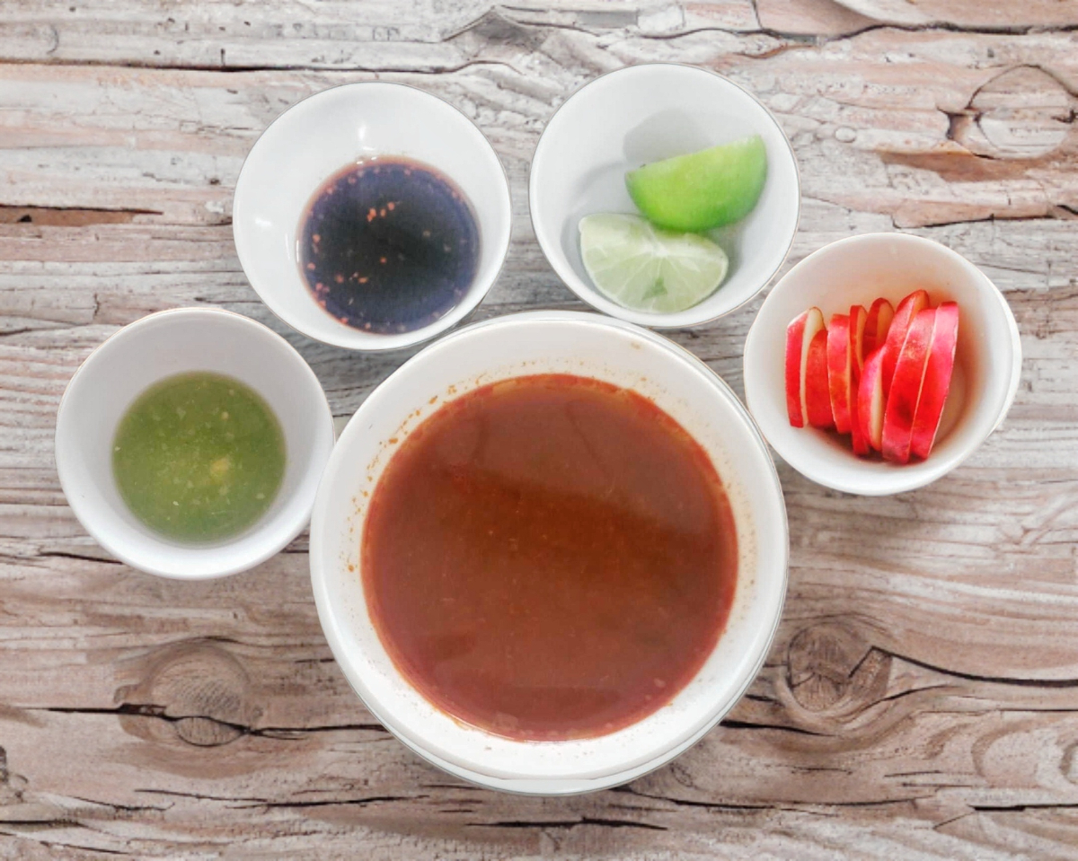 Consome sin carne, cilantro, cebolla, limon, salsas verde