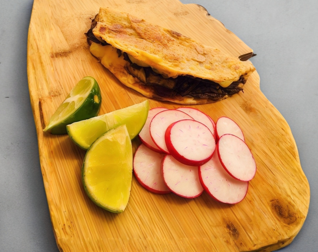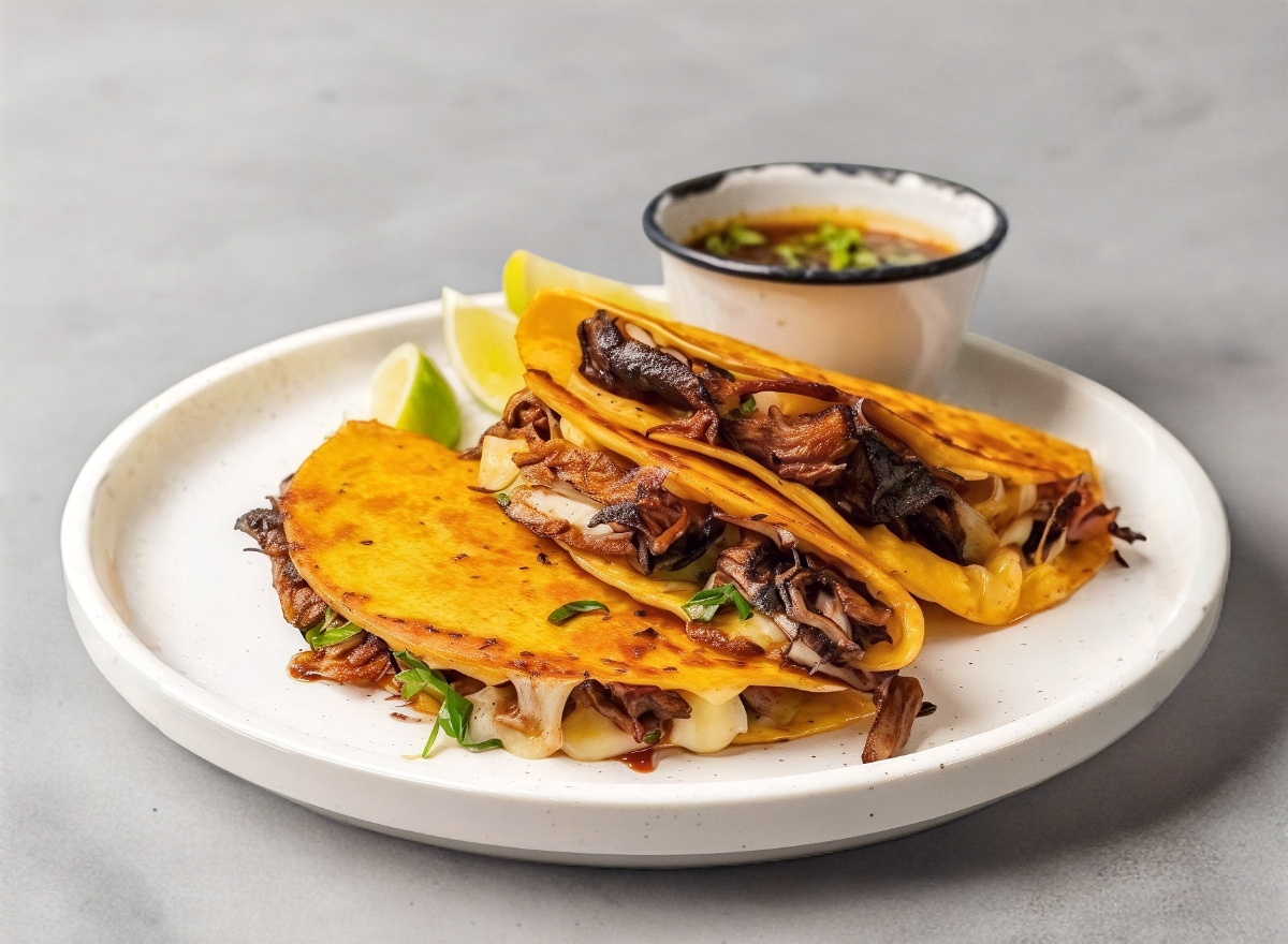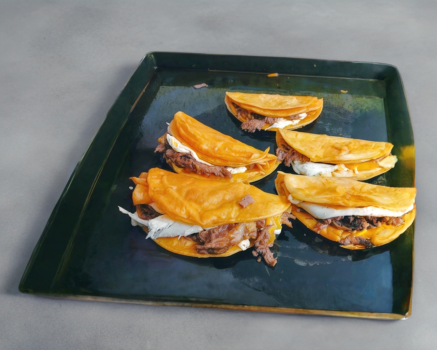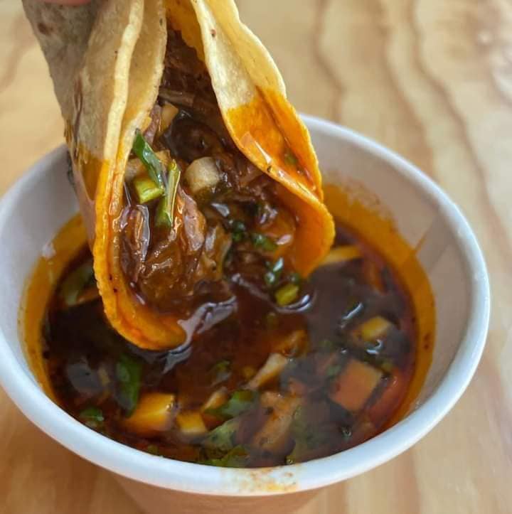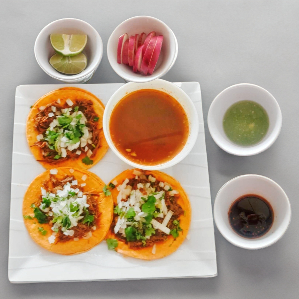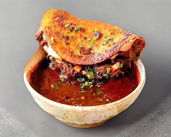 Doble tortilla de maíz remojado en consome, queso Oaxaca, 35 g Birria, cebolla, cilantro, limón, salsa. Por unidad