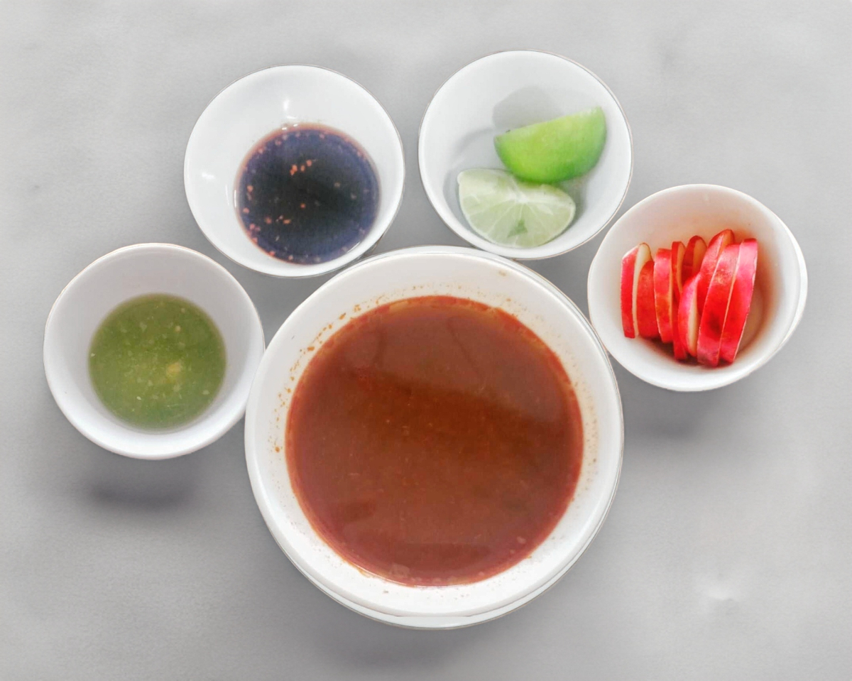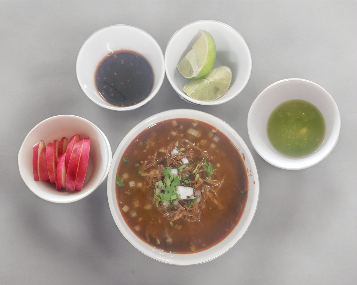 Medio litro de consomé con 140g carne, tortillas mas complementos