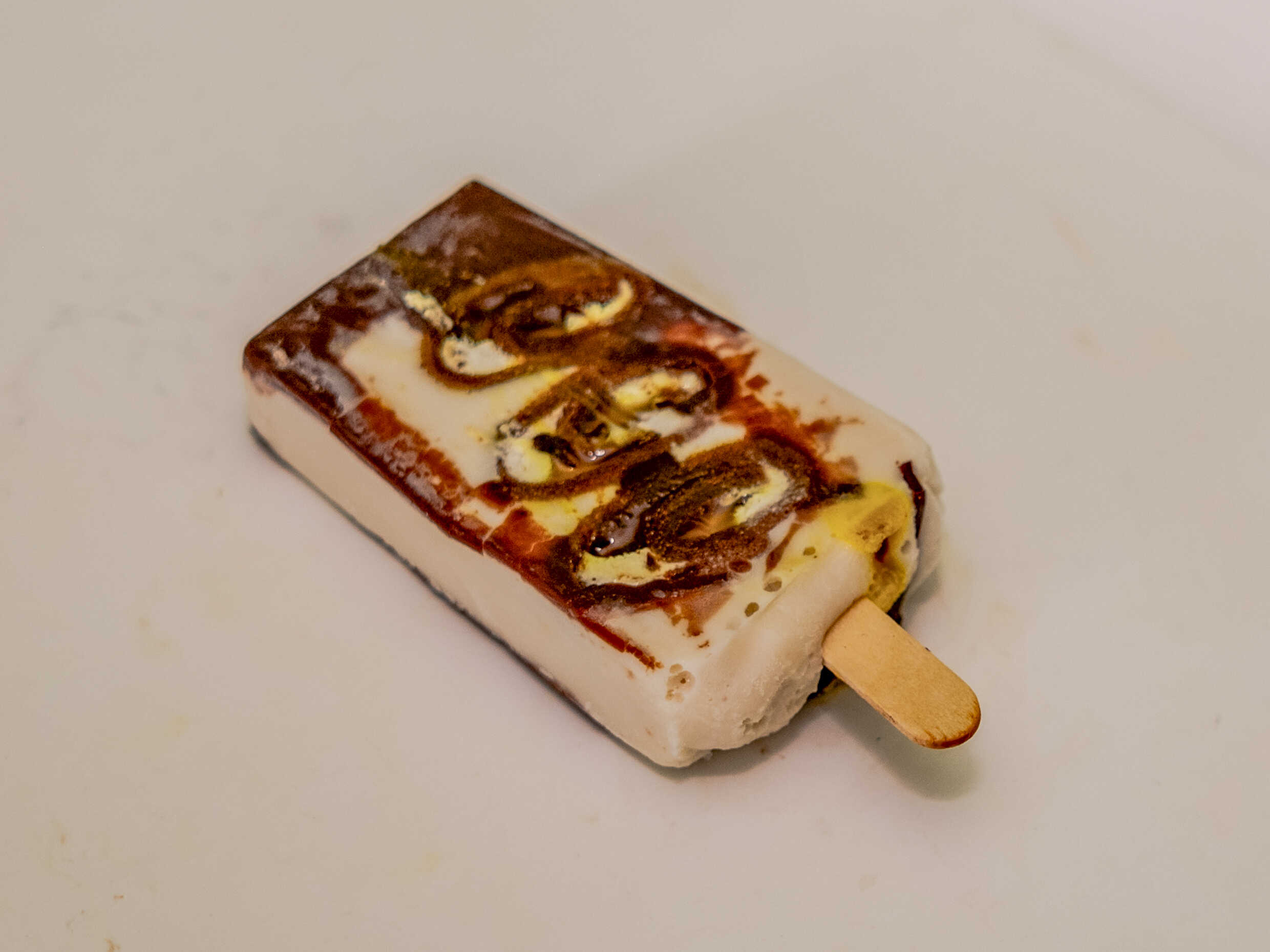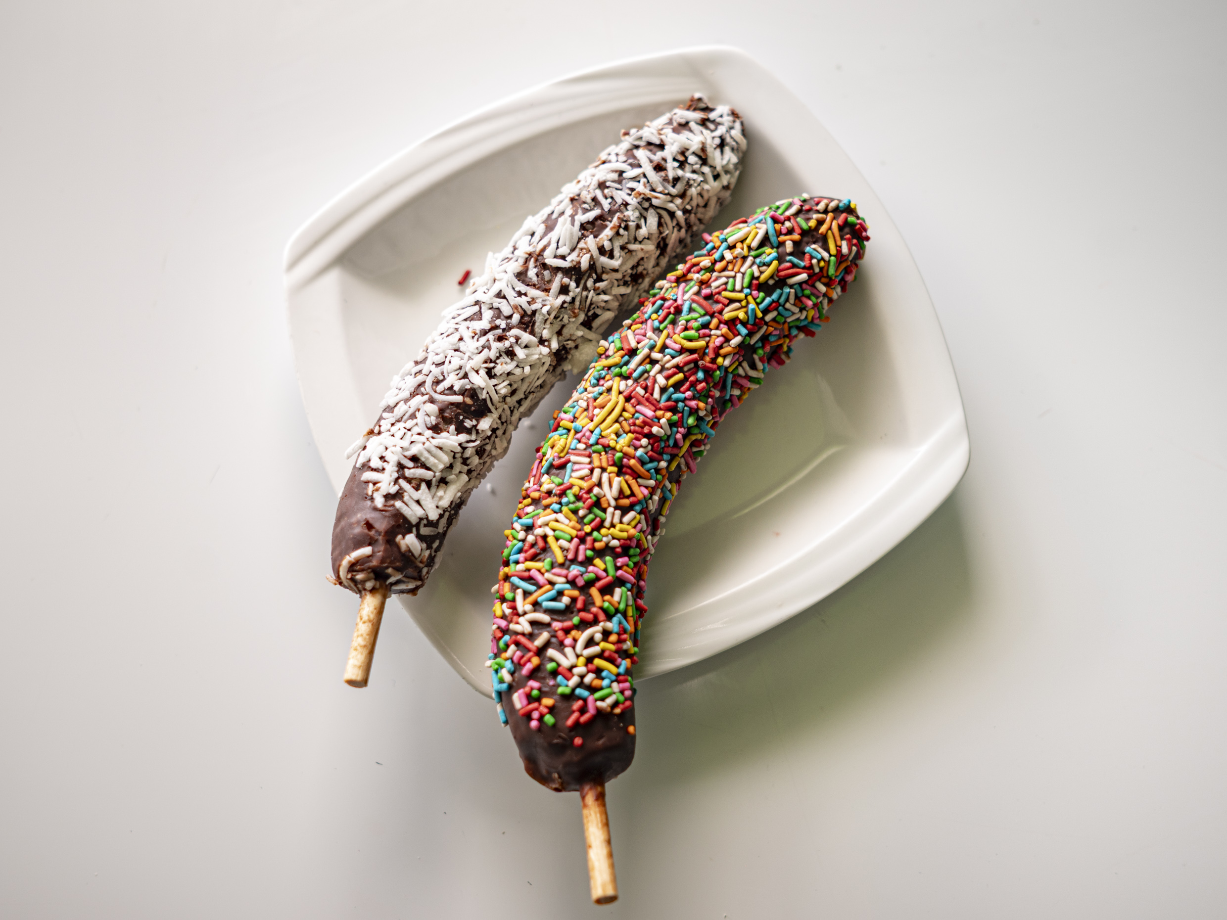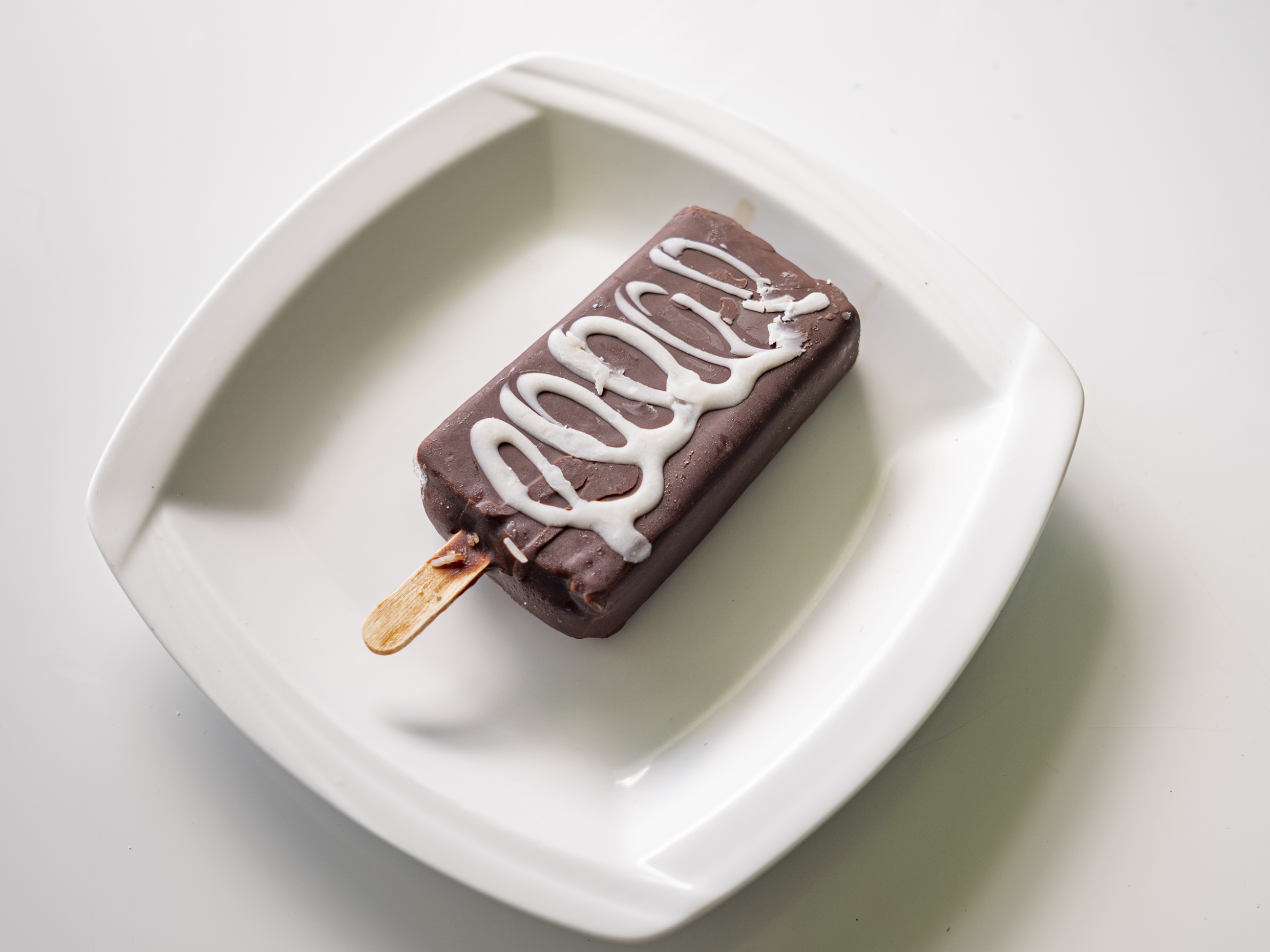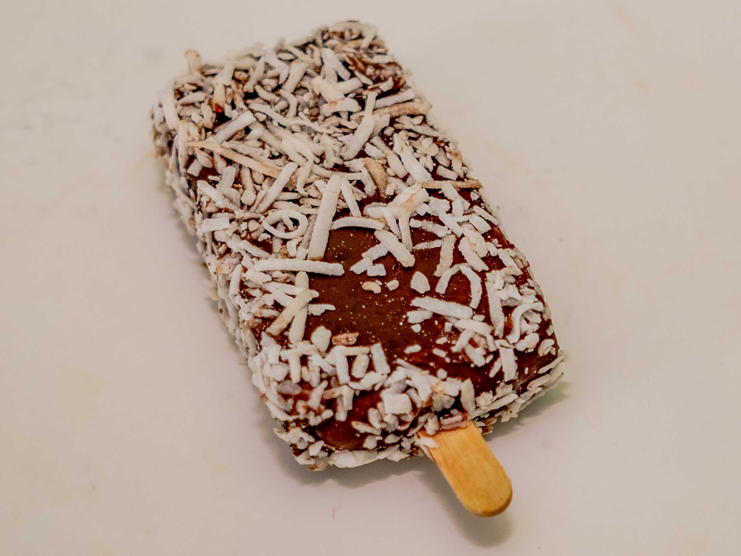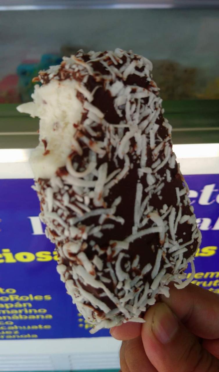 Deliciosa paleta de coco natural cubierta en chocolate y topping de coco rallado