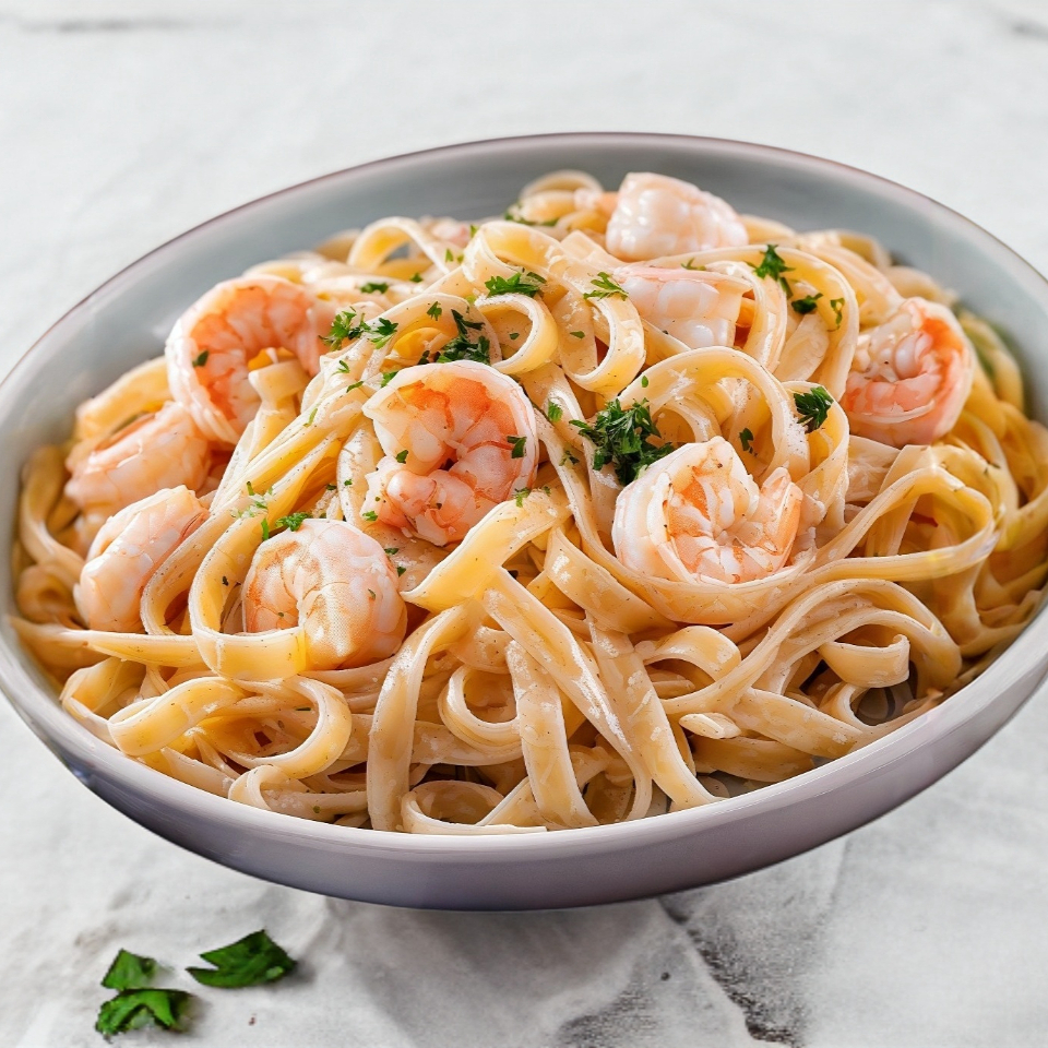 Clásica pasta cremosa, salteada con Camarones (70g), jamón, cebolla, ajo, parmesano y perejil. ( De 400 a 450g)