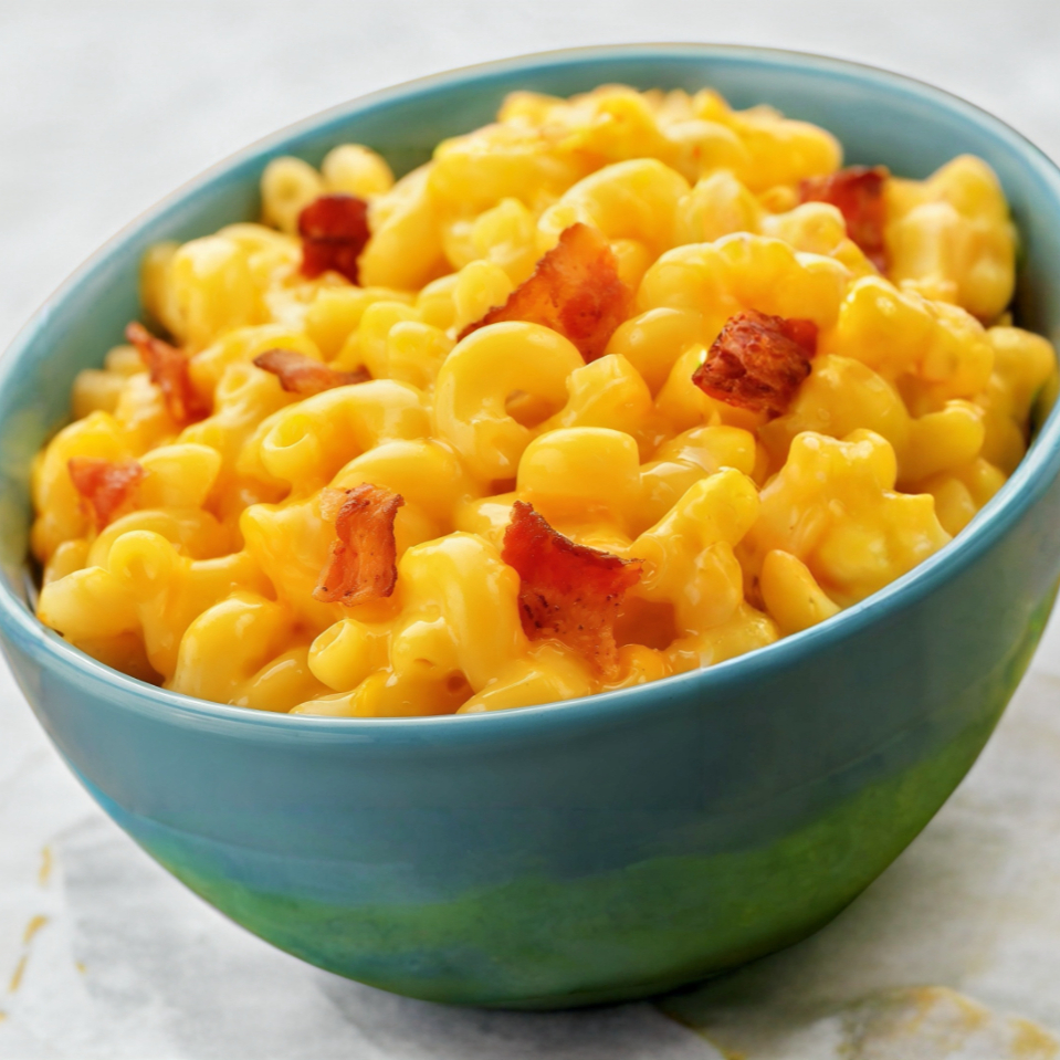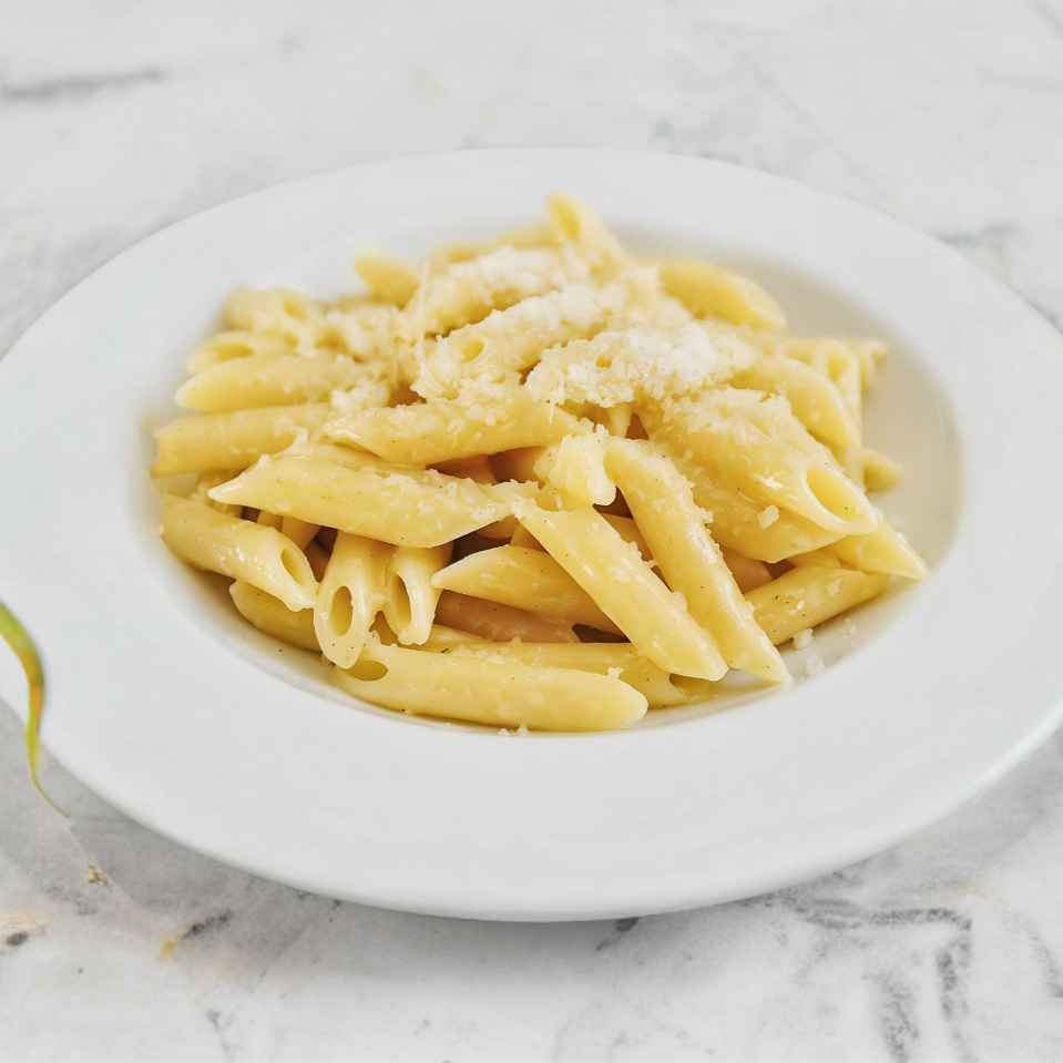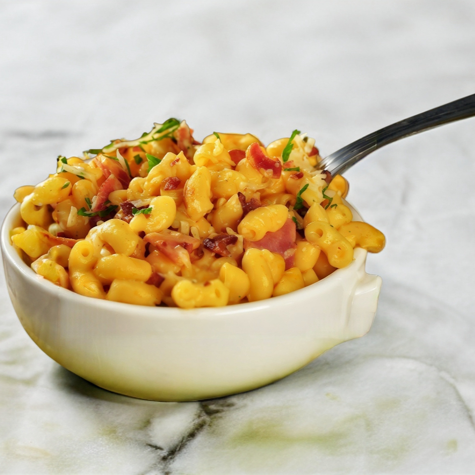 Macarrones acompañados con una salsa de queso, tocino, cebolla, ajo, parmesano, y perejil fresco. El favorito de los niños (250g a 350 g)