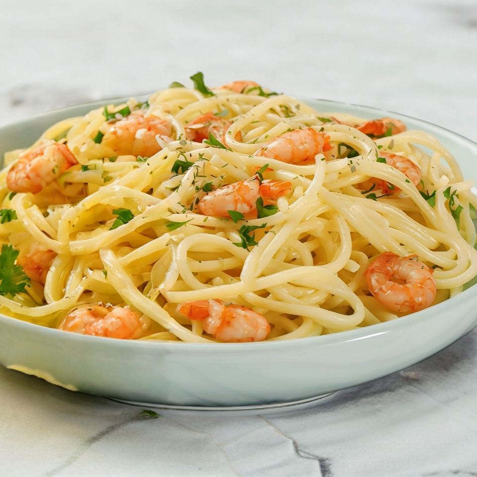 Pasta salteada con camarones (70g), aceite de oliva, jamón, tocino, cebolla, ajo, acompañada de una salsa de chipotle cremosa y perejil.(De 400g a 450g)