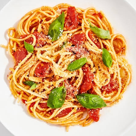 Pasta salteada con cebolla, ajo, chile quebrado, salsa pomodoro, especias, queso parmesano y pereji fresco. (De 400g a 450g)