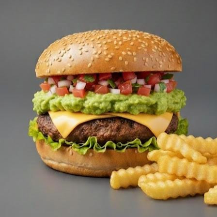 Rica carne de la casa, queso americano derretido acompañado de sus vegetales frescos lechuga, mexicana, guacamole. Incluye papas