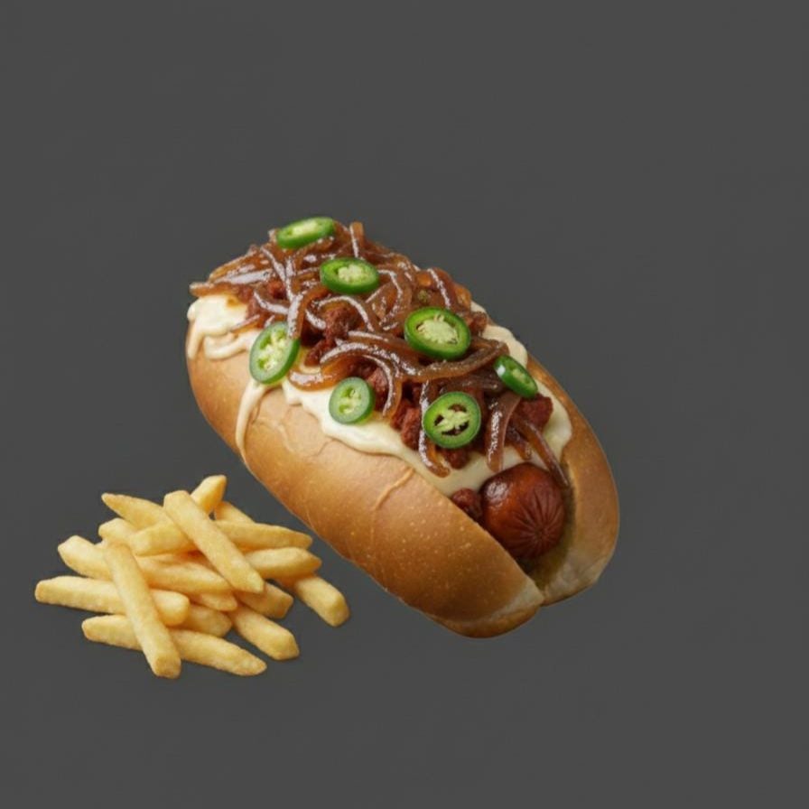 Rica salchicha frita, acompañada de sus vegetales frescos tomate, cebolla, jalapeños y su respectiva mayonesa y catsup. Incluye papas