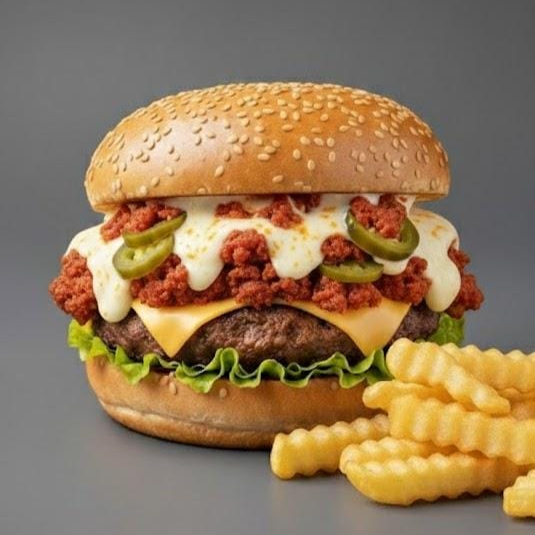 Rica carne de la casa, chorizo gratinado con queso oaxaca, queso americano derretido acompañado de sus vegetales frescos lechuga, tomate, cebolla caramelizada, jalapeños y su respectivo aderezo de la casa. Incluye papas🍟🍔
