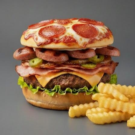 Rica carne de la casa, salchicha, aros de cebolla, queso americano derretido, jalapeños, salsa de pizza, queso mozzarella, peperoni. Incluye papas