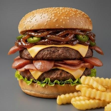 Rica doble carne de la casa, doble jamón, aros de cebolla, doble queso americano derretido acompañado de sus vegetales frescos lechuga, tomate, jalapeños y su respectivo aderezo de la casa. Incluye papas🍟🍔