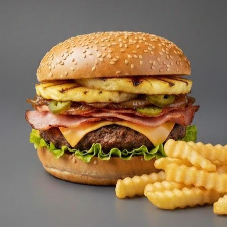 Rica carne de la casa, jamón, piña, queso americano derretido acompañado de sus vegetales frescos lechuga, tomate, cebolla caramelizada, jalapeños y su respectivo aderezo de la casa. Incluye papas🍟🍔