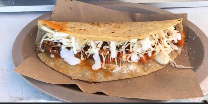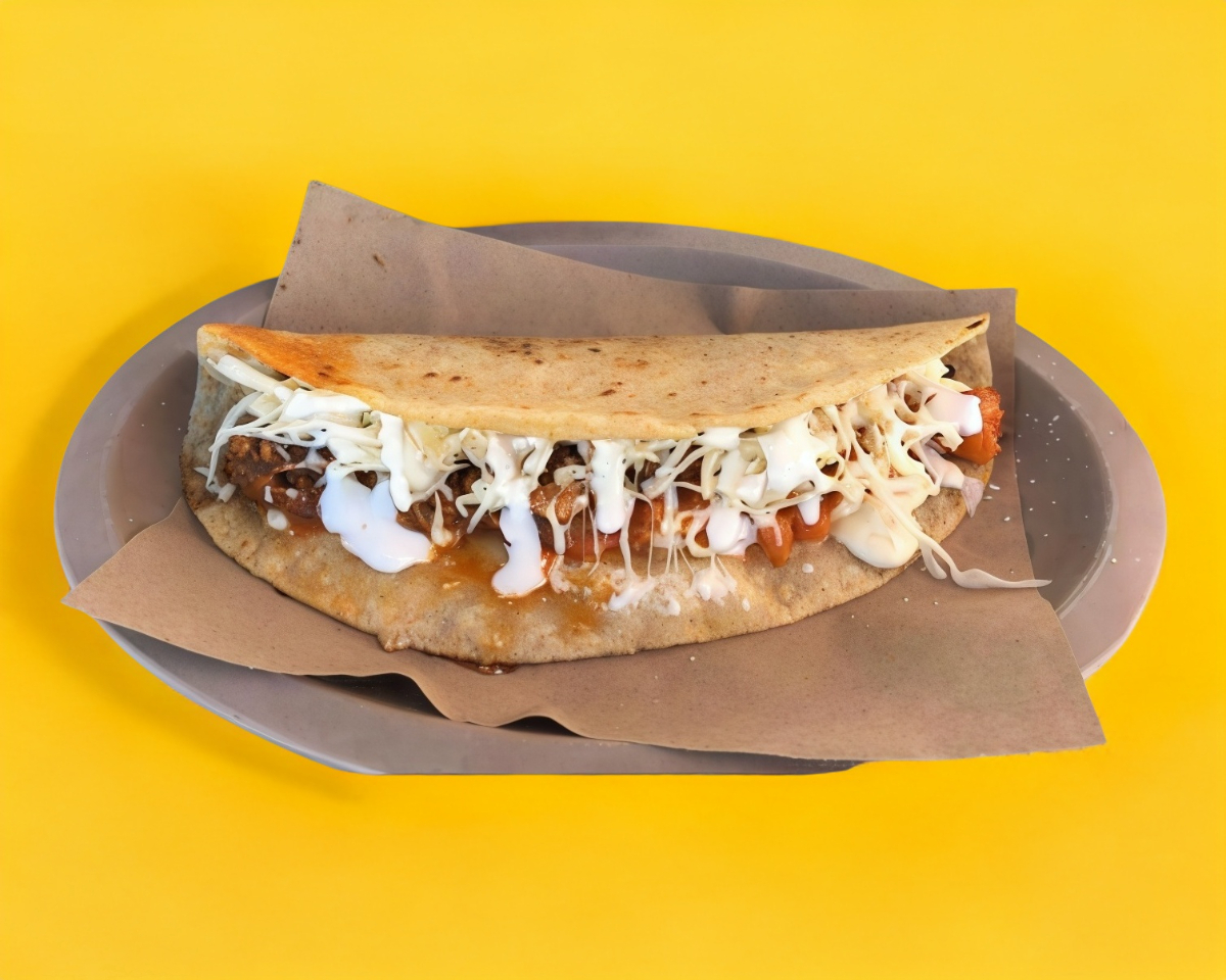Tortilla masa de maíz, queso oaxaca, chicharrón prensado, lechuga y crema