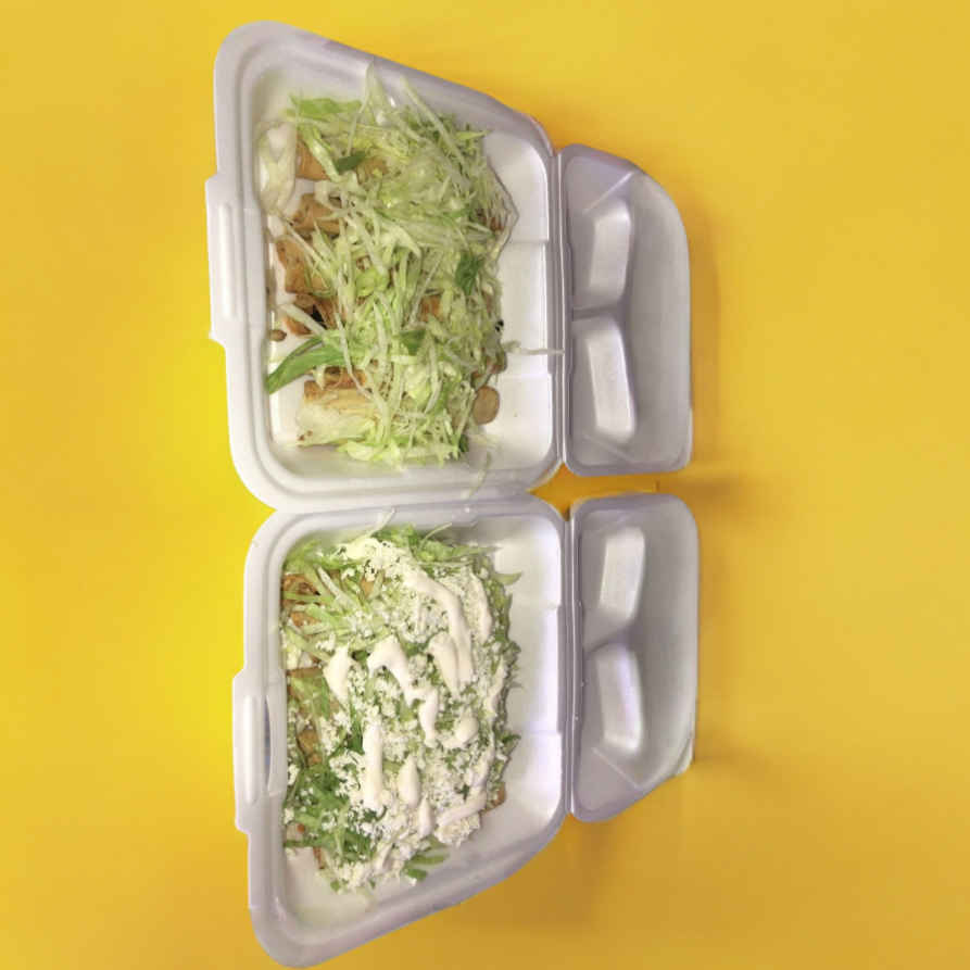 ORDEN DE 5 TACOS CON QUESO, LECHUGA, CREMA Y AROS DE CEBOLLA.