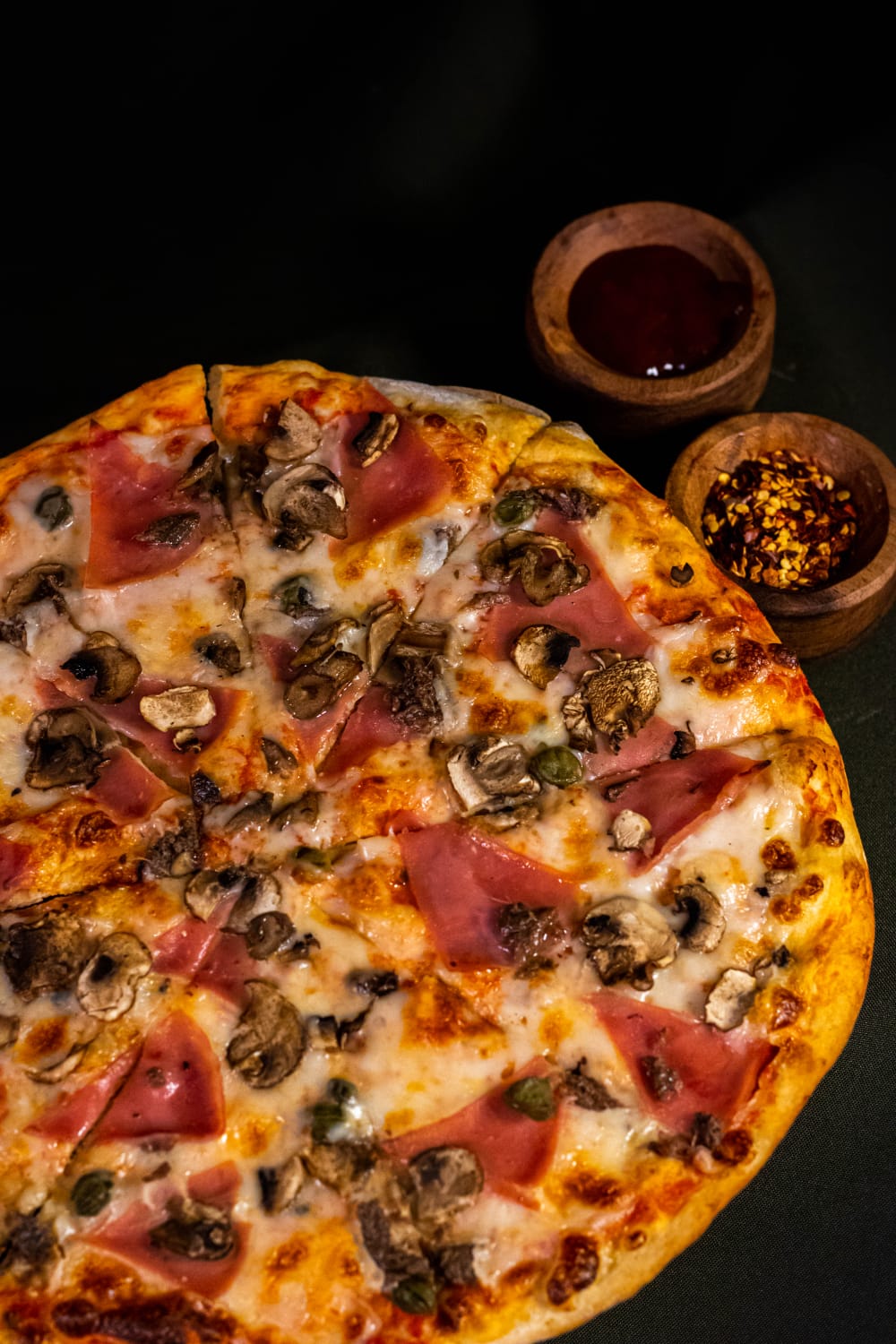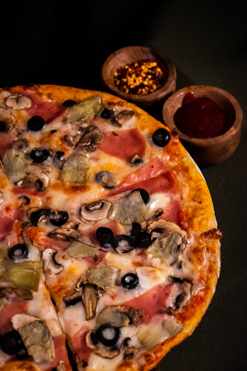 Alcachofas, aceitunas, champiñón, jamón y pimiento.