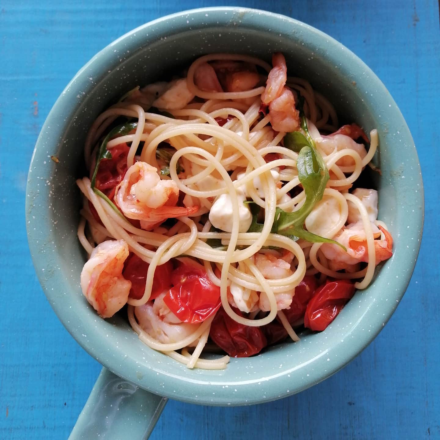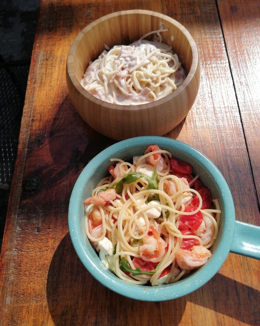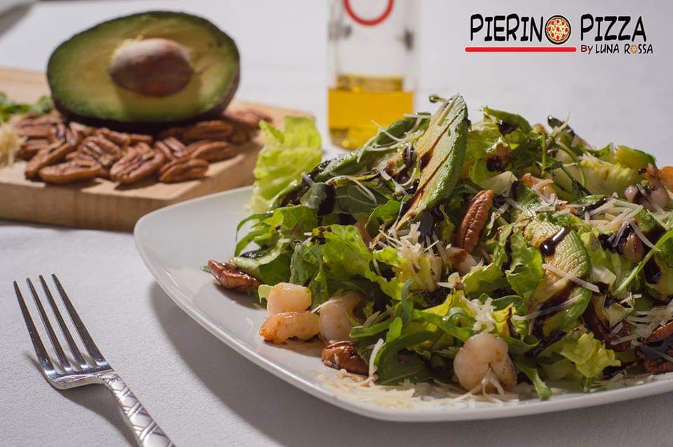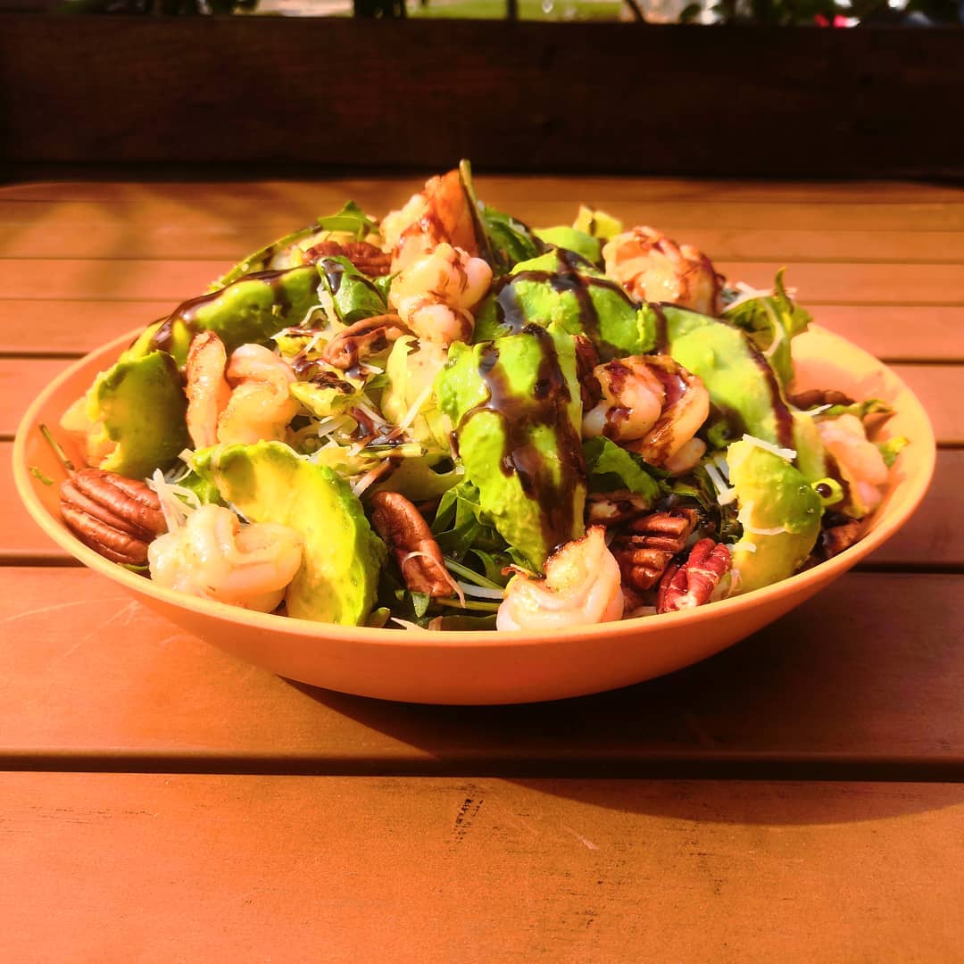 Arúgula, lechuga, camarón, nuez, parmesano y aguacate. Adecuada con aceite de olivo y balsámico.