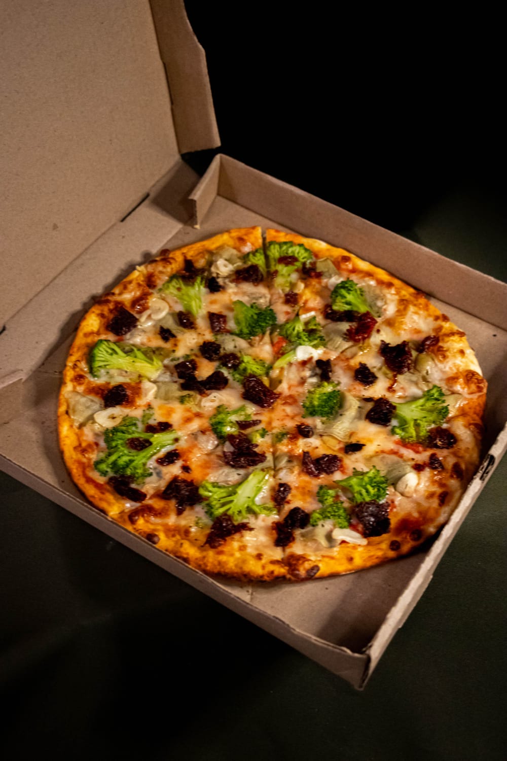 Tomate deshidratado, queso de cabra, champiñones, aceitunas negras.