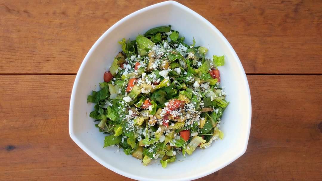 Arúgula, lechuga, pepino, cebolla, tomate, olivos, queso de cabra y orégano.