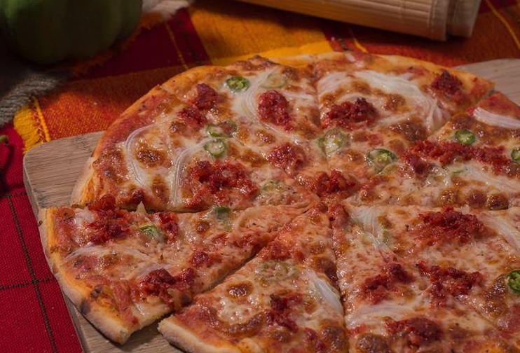 Pepperoni, jamón, chorizo, tocino, pimiento verde y cebolla.