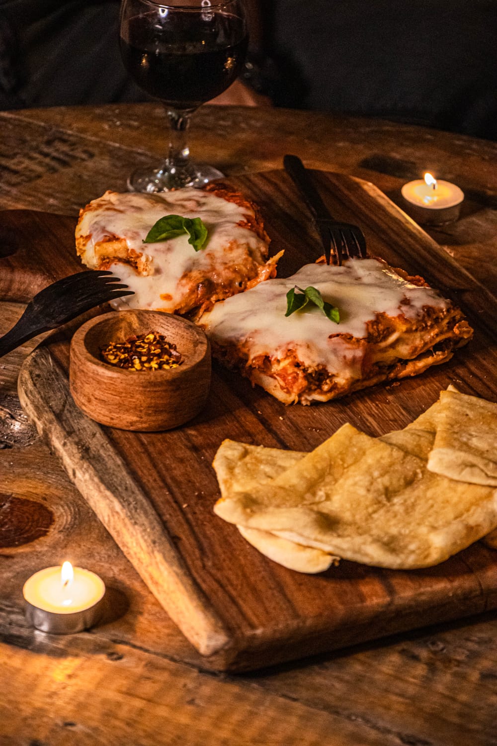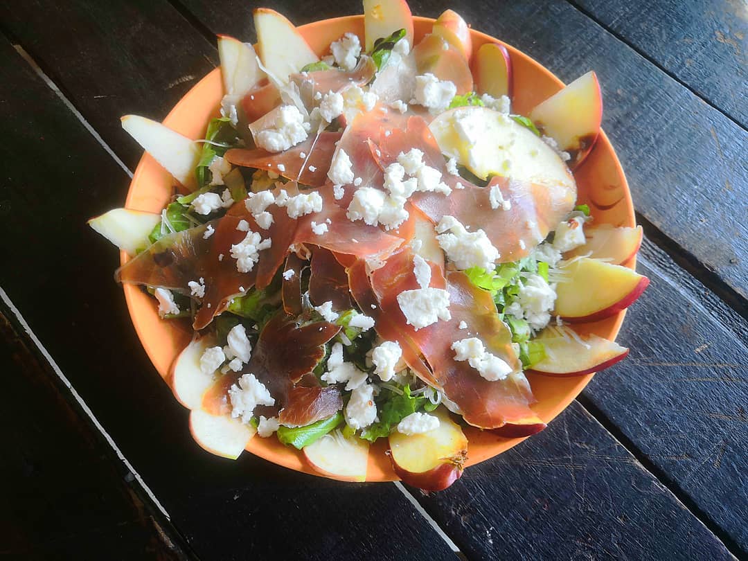 Arúgula, lechuga, manzana, jamón serrano y queso de cabra. Aderezada con aceite de olivo y balsámico.