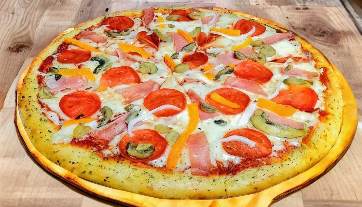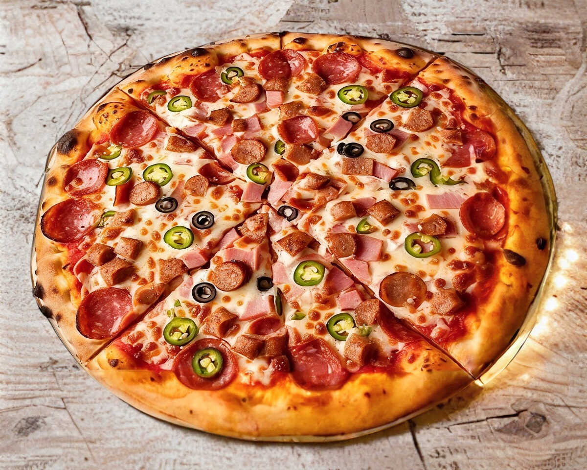 Pizza Grande con Pepperoni, Salchicha, Tocino, Jamón, Salami, Aceituna negra, Jalapeños y doble queso mozzarella (orilla de ajo opcional)