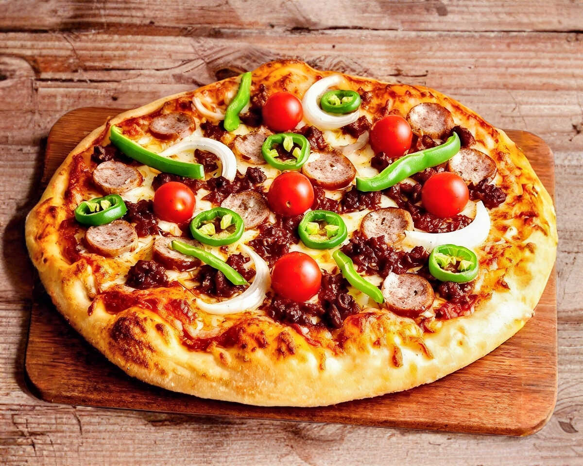 Pizza grande con Chorizo, Salchicha, Pimiento, Cebolla, Jalapeños, Tomate cherry y Queso mozzarella (Orilla de ajo opcional)