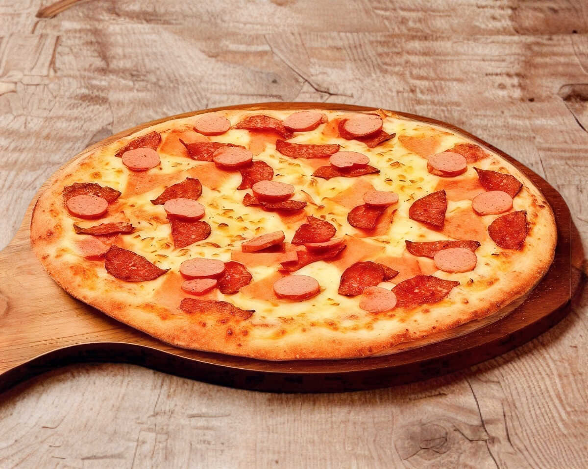 Pizza grande con Salchicha, Salami, Jamón y Queso mozzarella (Orilla de ajo opcional)