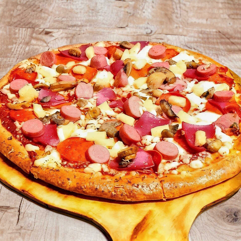 Pizza Grande con Salami, Salchichas, Champiñones, Aceituna y Pimiento (orilla de ajo opcional)