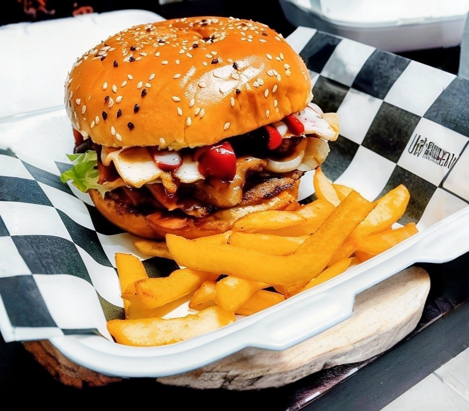 100% carne, Jamón, Queso Oaxaca, Chorizo, Cebolla Caramelizada, acompañado de papas a la francesa
