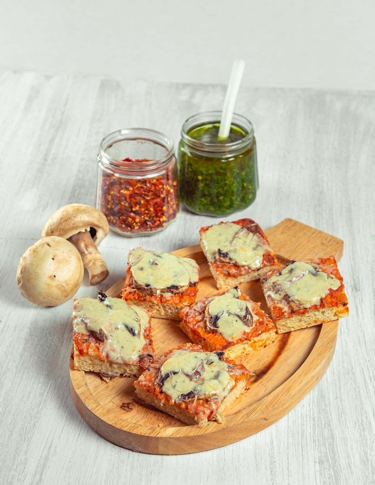 Queso mozzarella, champiñones, queso philadelphia y jamón de pavo.