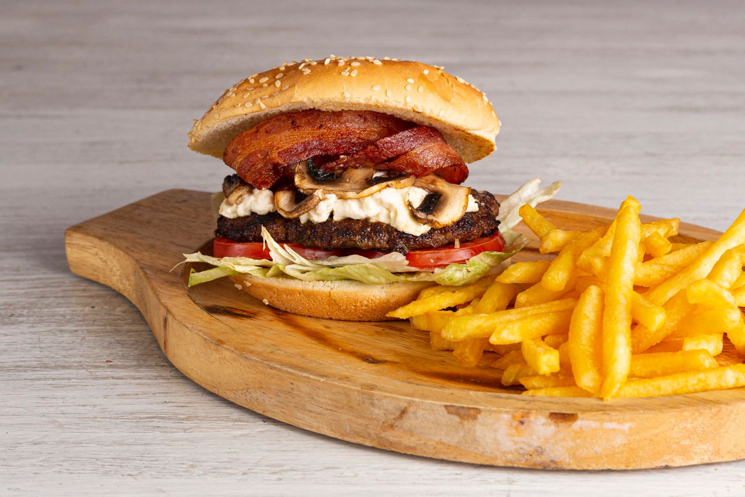 150 gr carne de res, champiñones asados, tocino y queso gouda.