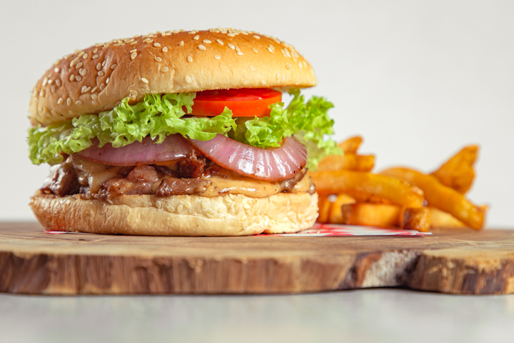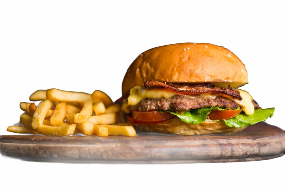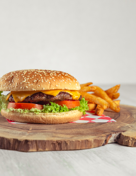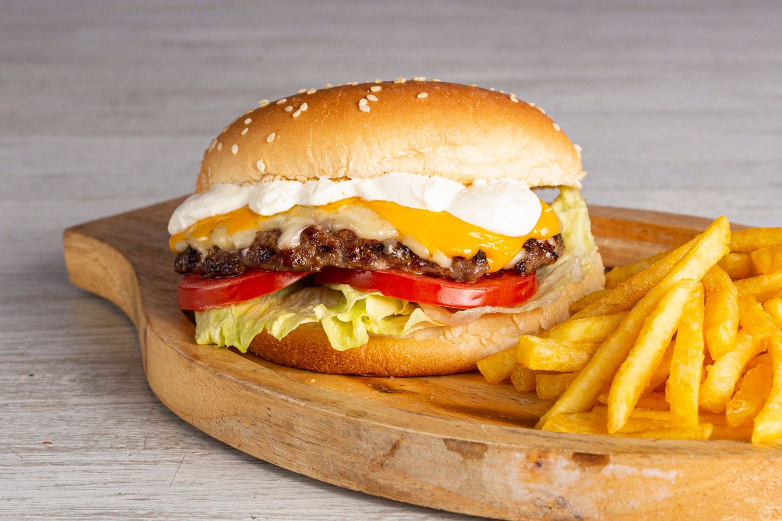 150 gr carne de res y a escoger queso gouda o americano, acompañado de papas a la francesa.