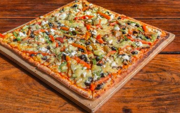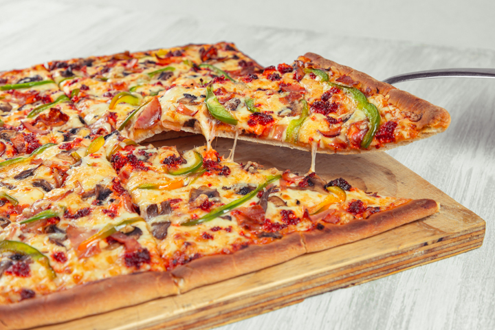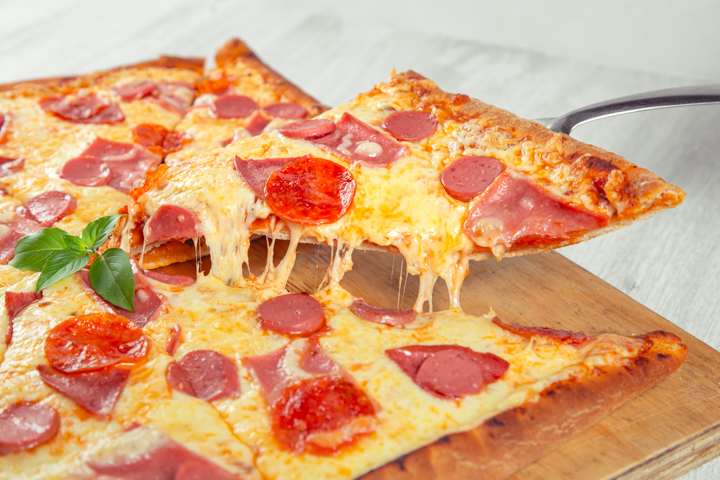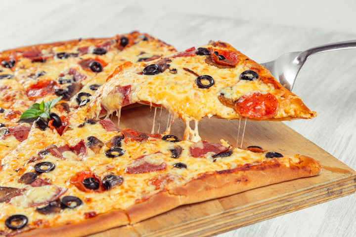Queso mozzarella, pepperoni, pimiento, champiñones y aceitunas.