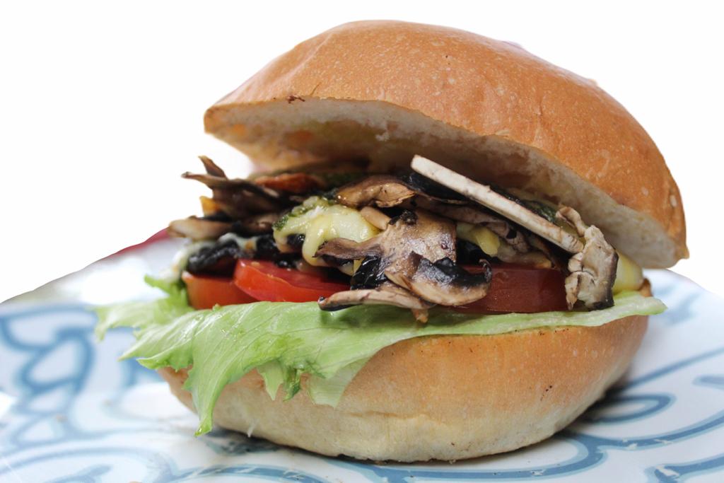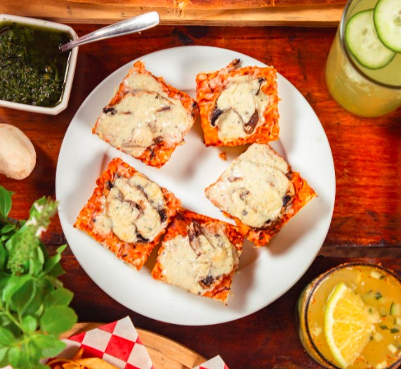 150 gr de carne de res, champiñones asados, queso de cabra y pesto de albahaca.