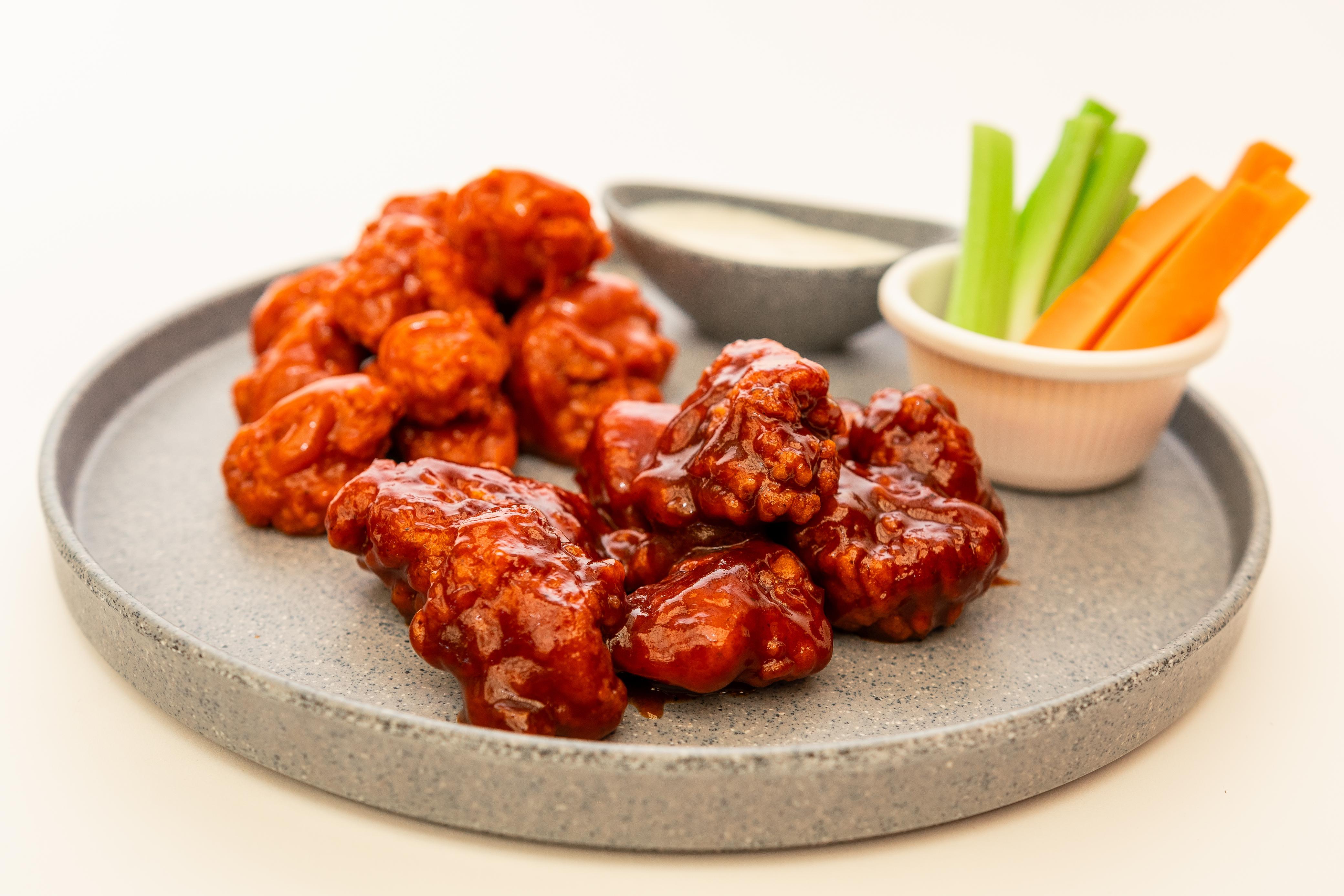 Deliciosas alitas picantes acompañadas de aderezo ranch o queso azul y verduras.