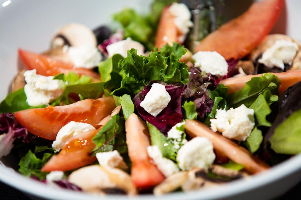 Mezcla de lechugas orgánicas, arúgula de huerto, champiñón fresco, pimiento verde, jitomate, semilla de girasol, quesos de cabra y parmesano.