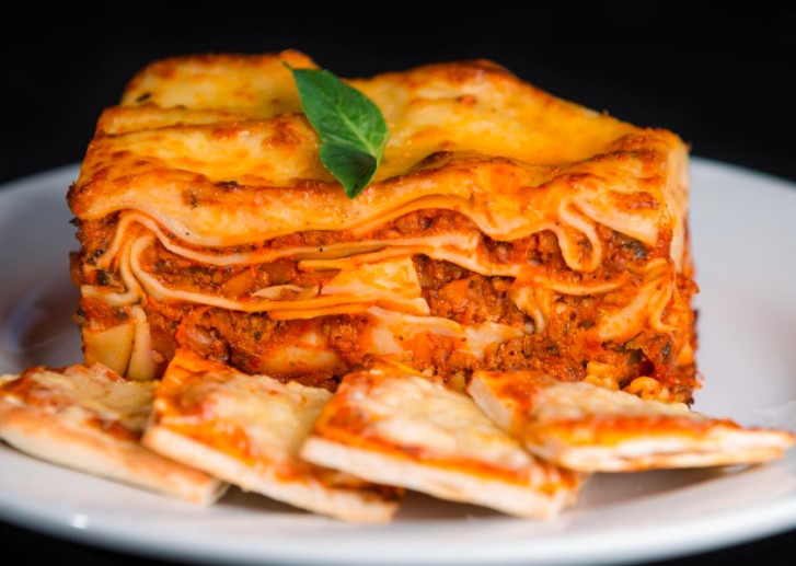 Deliciosa receta italiana casera, carne de res, quesos, salsa blanca, albahaca y hierbas finas.