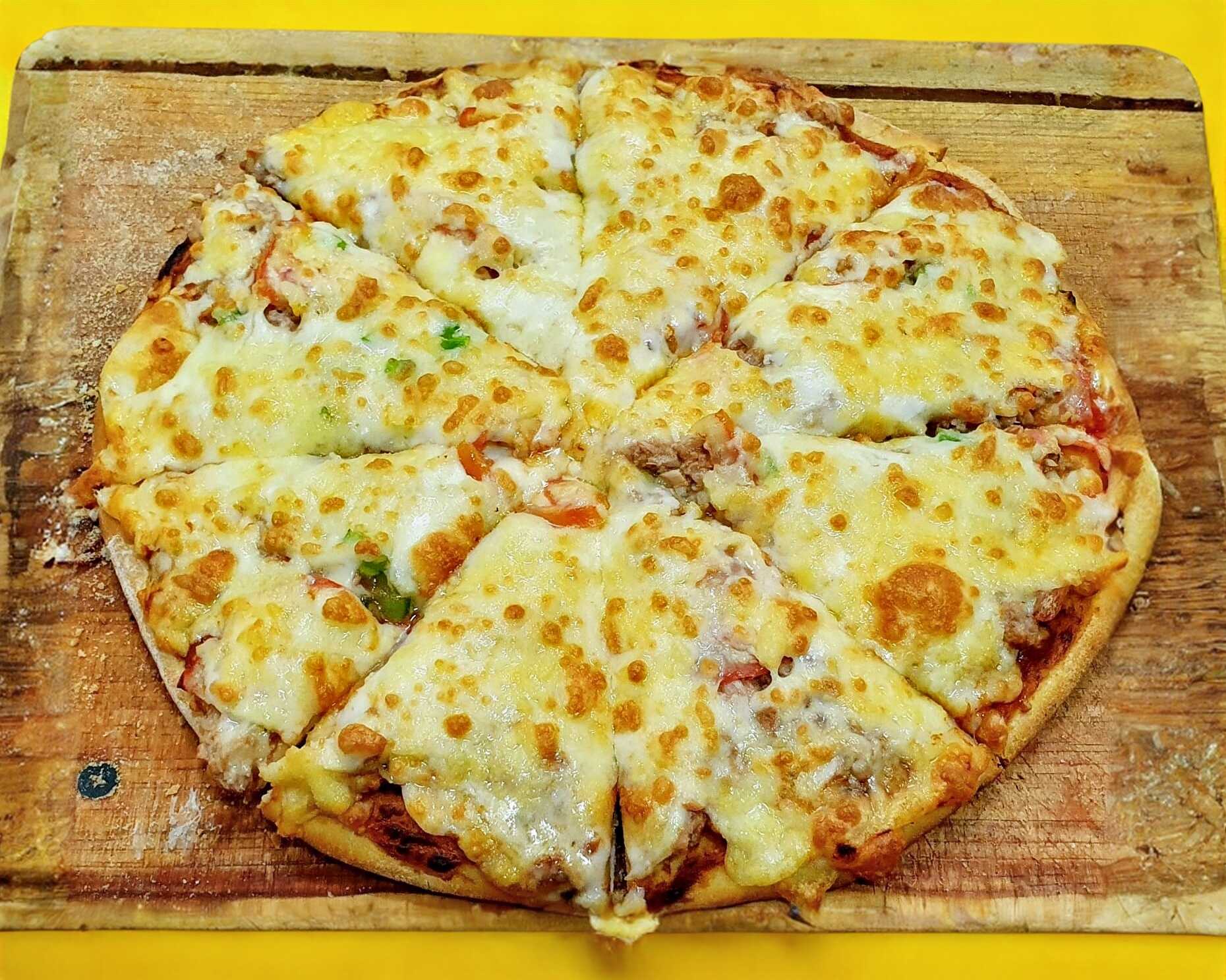 Pizza de 12" (8 rebanadas), atún, tomate, pimiento, cebolla y queso mozzarella