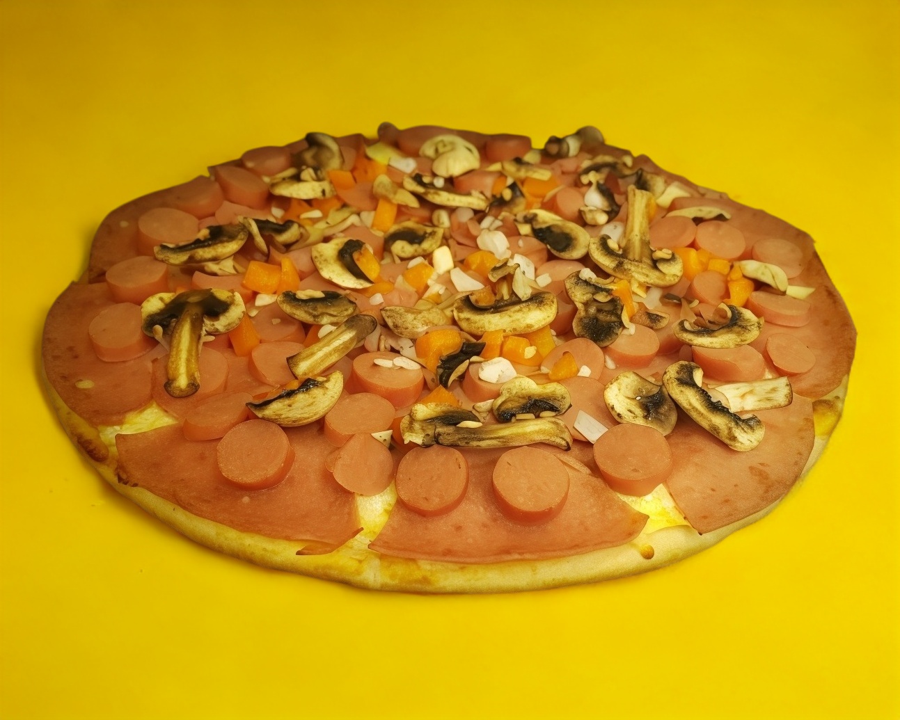 Pizza de 12" (8 rebanadas) jamón, salchicha, pimiento, cebolla, champiñones, queso mozzarella Pizza de 12" (8 rebanadas) jamón salchicha pimiento cebolla champiñones queso mozzarella para dos persona