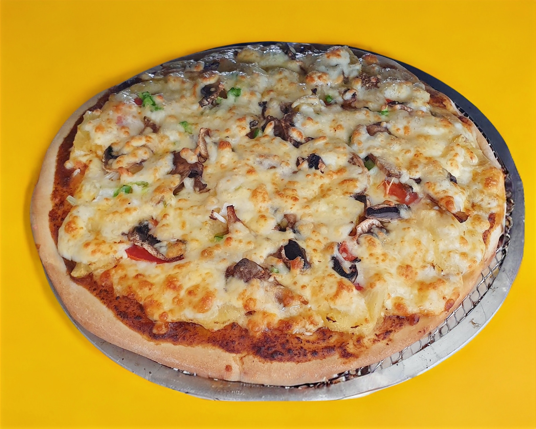 Pizza de 12" (8 rebanadas), tomate, piña, cebolla, champiñón, queso mozzarella