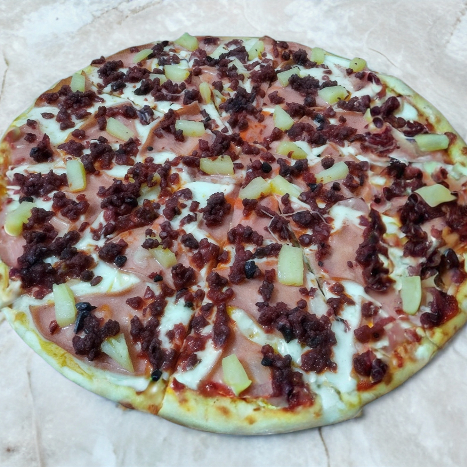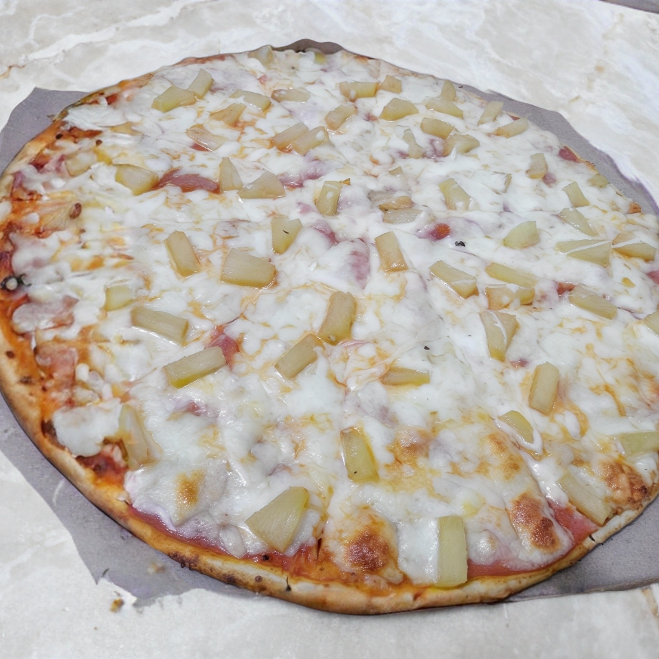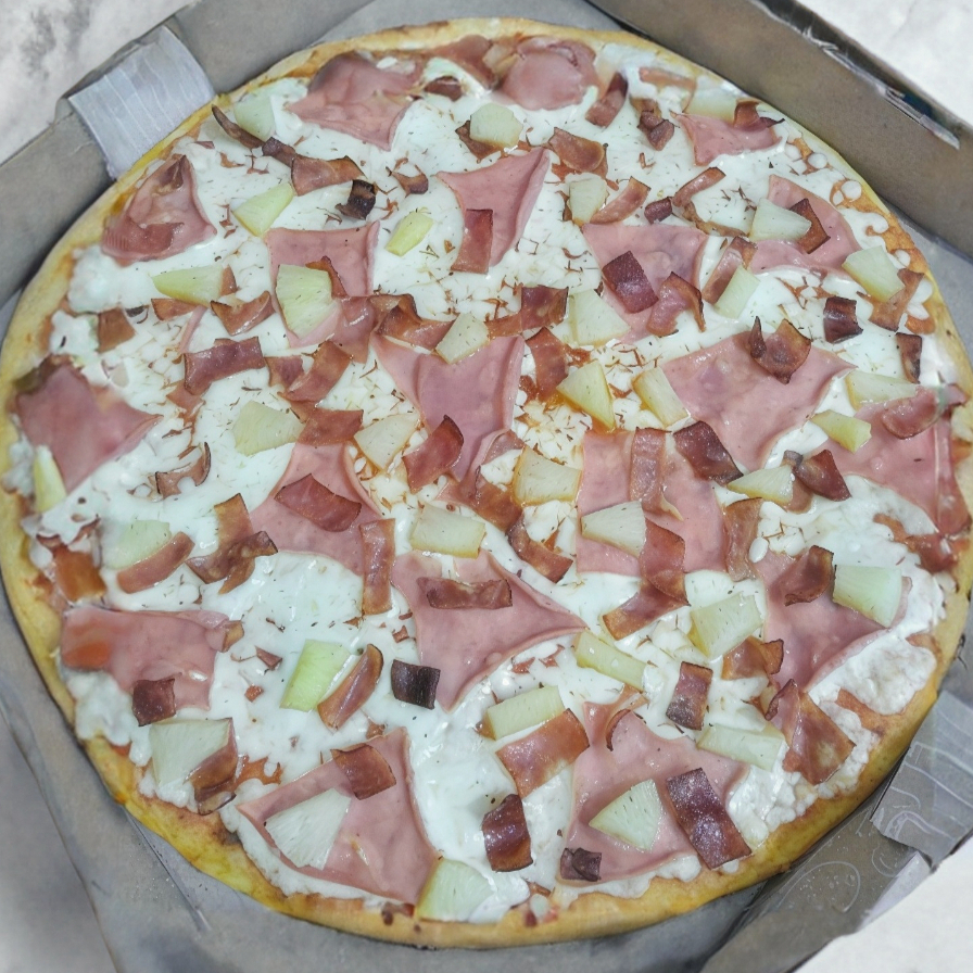 Base de Tomate, Queso Mozarella, Piña, Jamón, Chorizo, Masa Delgada ( 8 Rebanadas)