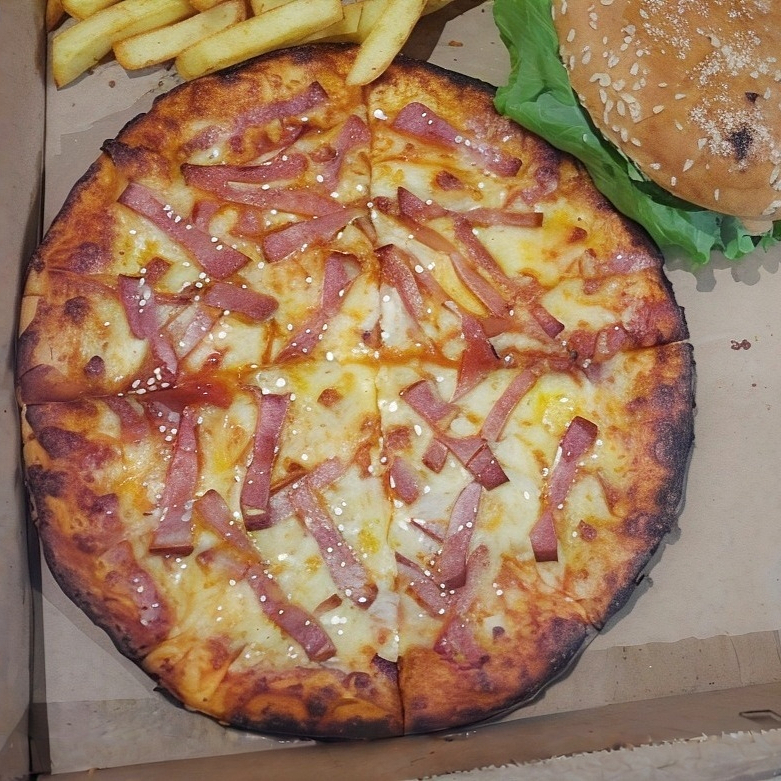 PIZZA MEDIANA DE 1 A 2 INGREDIENTES DE 8 REBANADAS MAS UNA HAMBURGUESA (No incluye papás ni refresco)