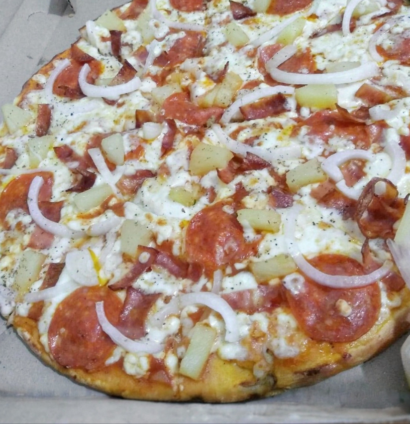 Cebolla, tocino, piña y pepperoni. 10 Rebanadas