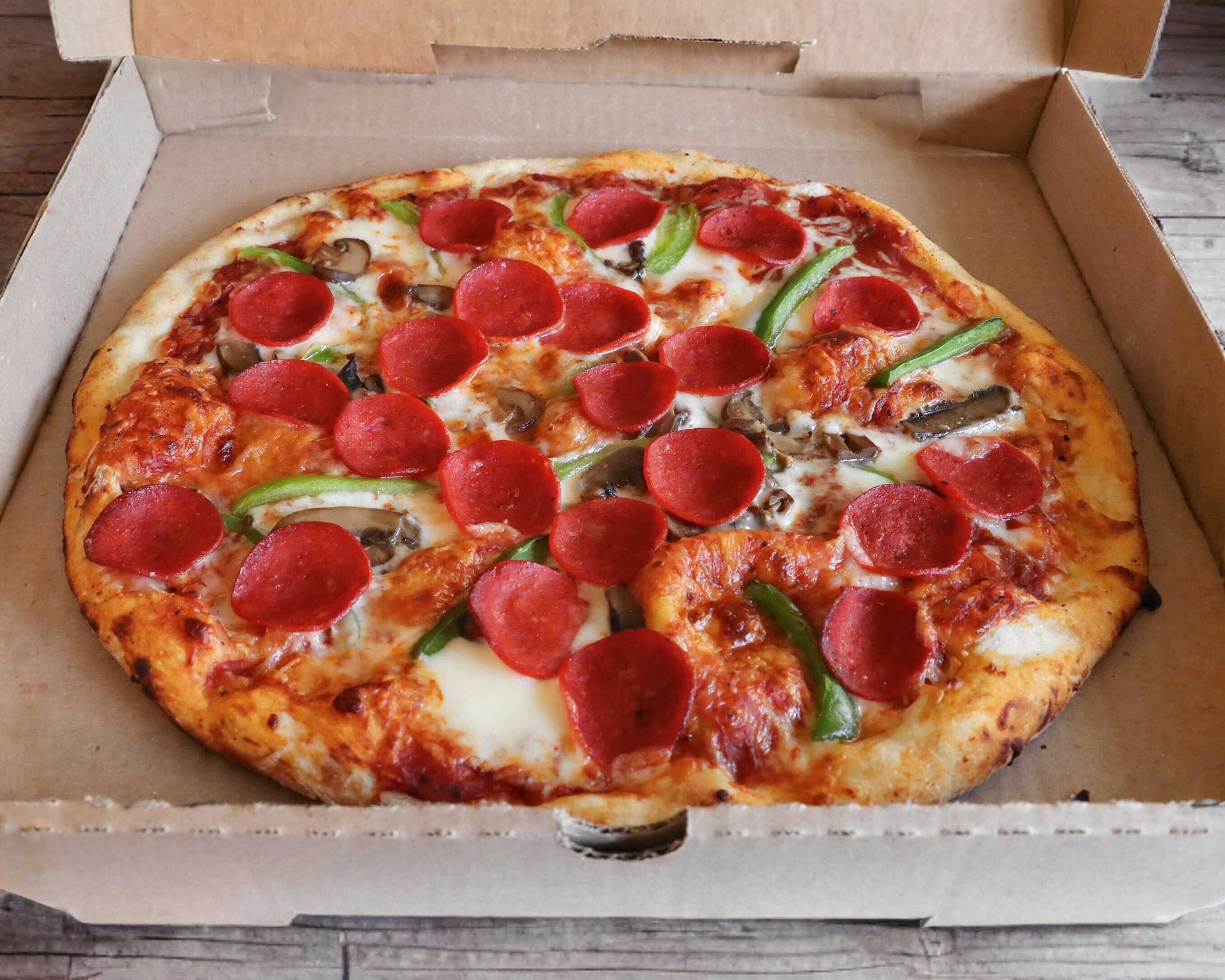 Pizza artesanal de 30 cm con 100 gr de queso mozzarella con pepperoni y champiñones, masa delgada y crujiente.