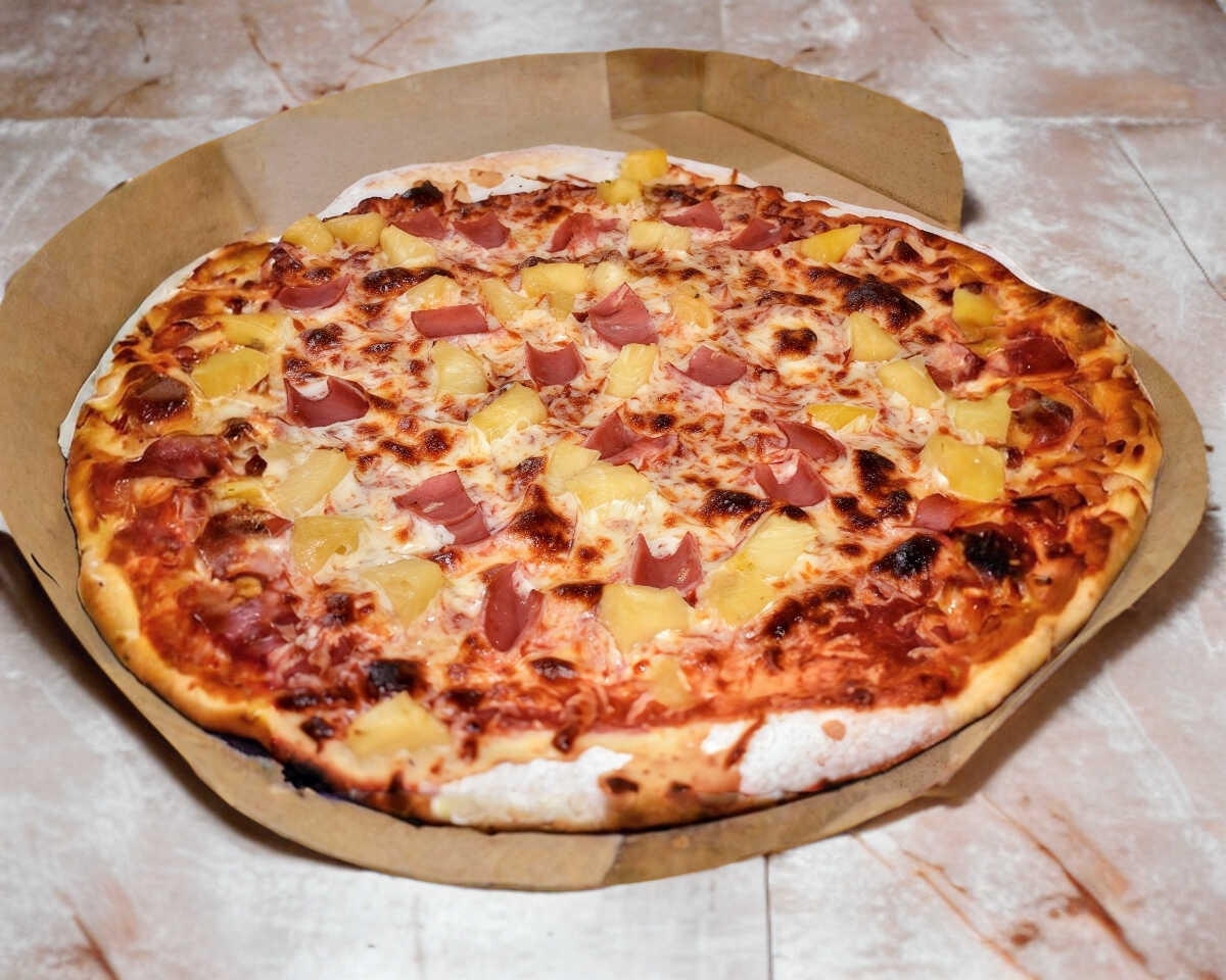 Pizza artesanal de 35 cm con 180 gr de queso mozzarella con piña y jamón masa delgada y crujiente estilo italiano.