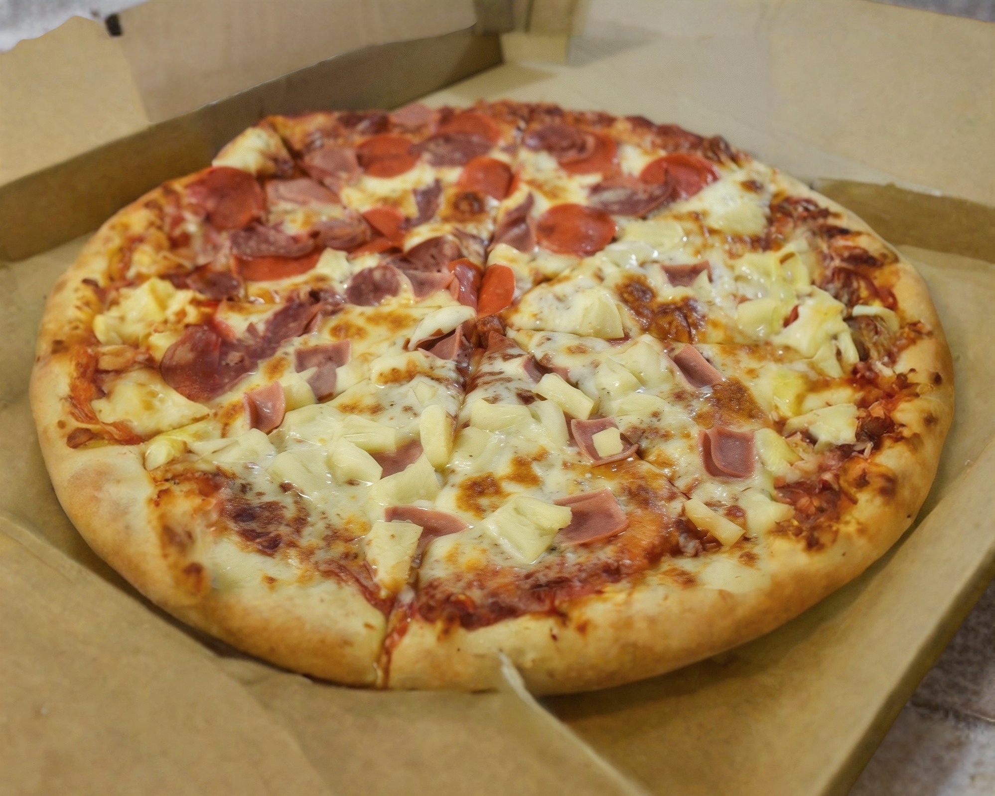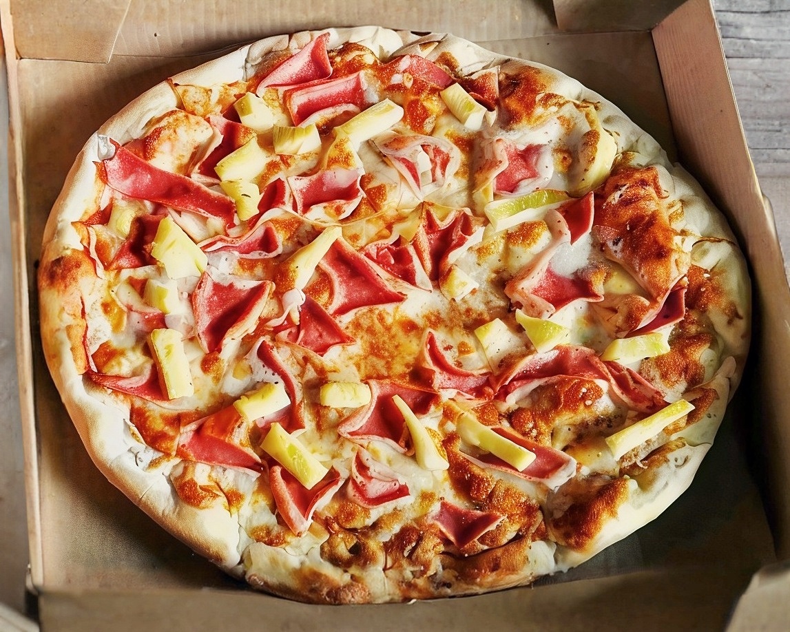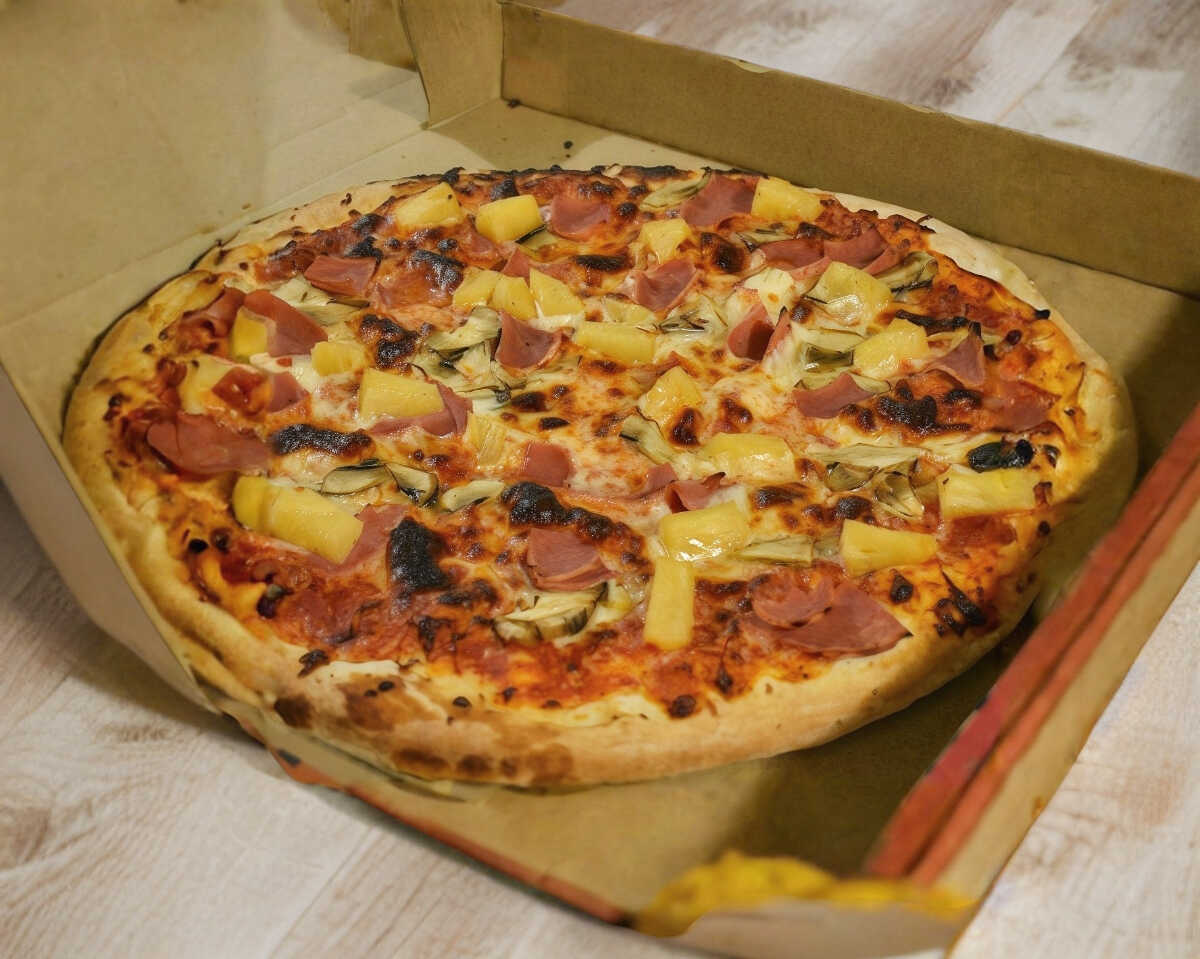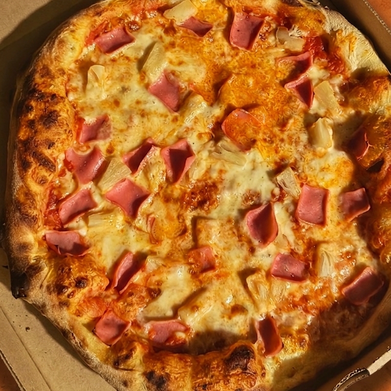 Pizza artesanal de 35 cm con 180 gr de queso mozzarella con jamón, champiñones y piña masa delgada y crujiente.