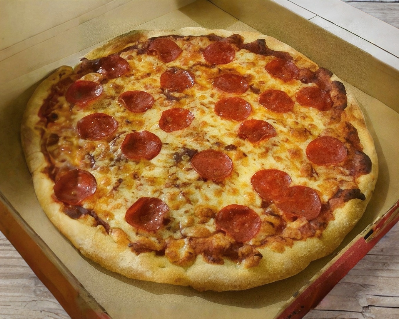 Pizza artesanal de 35 cm con 180 gr de queso mozzarella con pepperoni y champiñones masa delgada y crujiente.