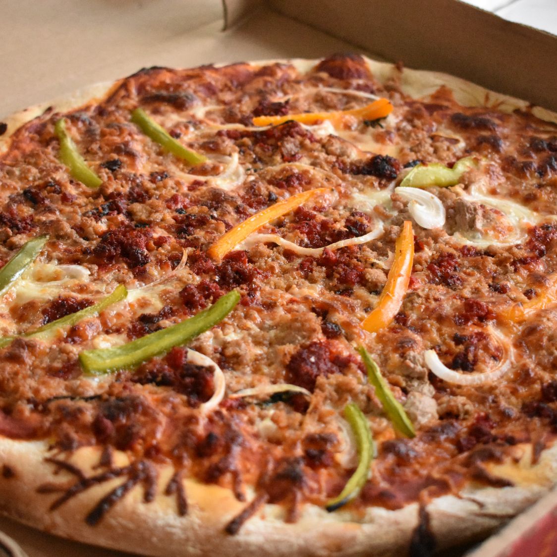 Pizza artesanal de 35 cm con 180 gr de queso mozzarella con jamón, pepperoni, champiñones, cebolla, aceituna negras pimientos masa delgada y crujiente estilo italiano.
