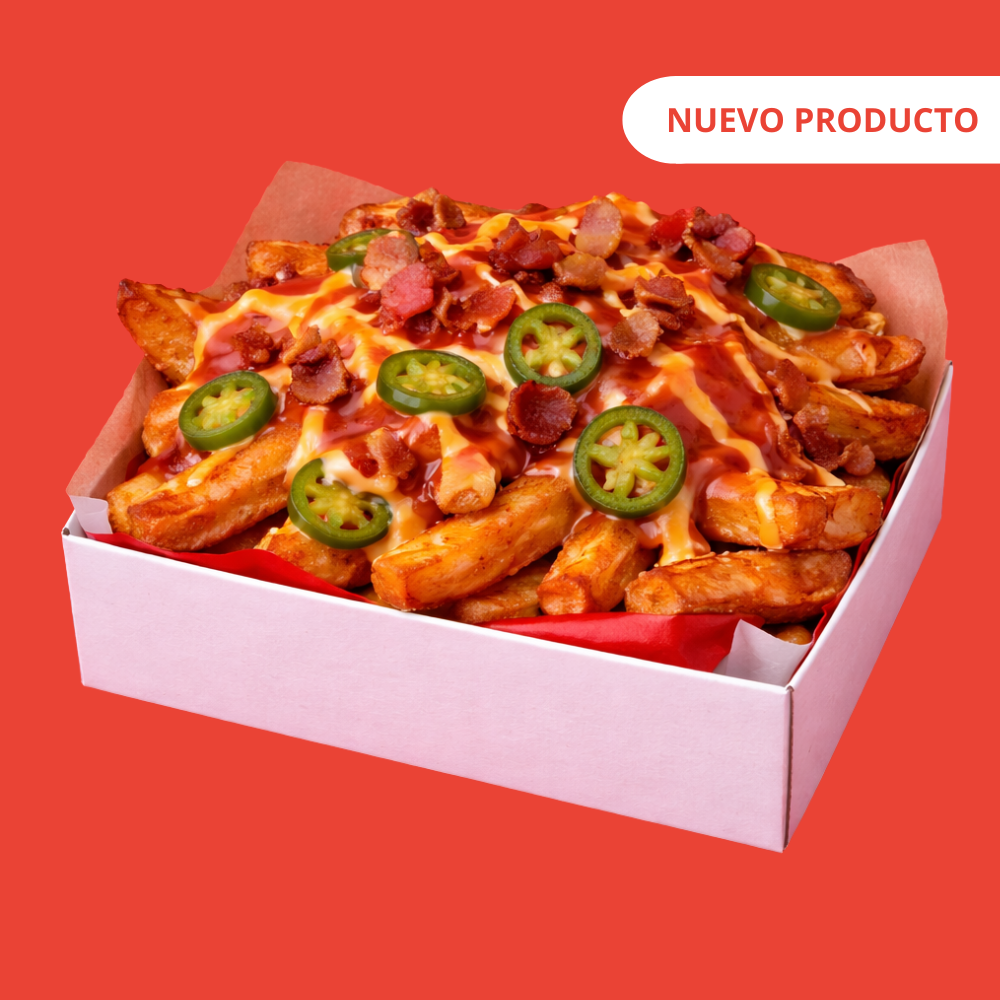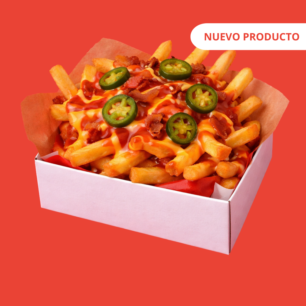 "Papas a la francesa largas, delgaditas y súper crujientes. Lo mejor: puedes añadirles tres toppings y tres salsas para llevarlas a otro nivel de sabor, textura y crunch. Ideales para botanear o acompañar cualquier box. (Porción: 250 g + 3 cups de 2 oz + 3 toppings)"