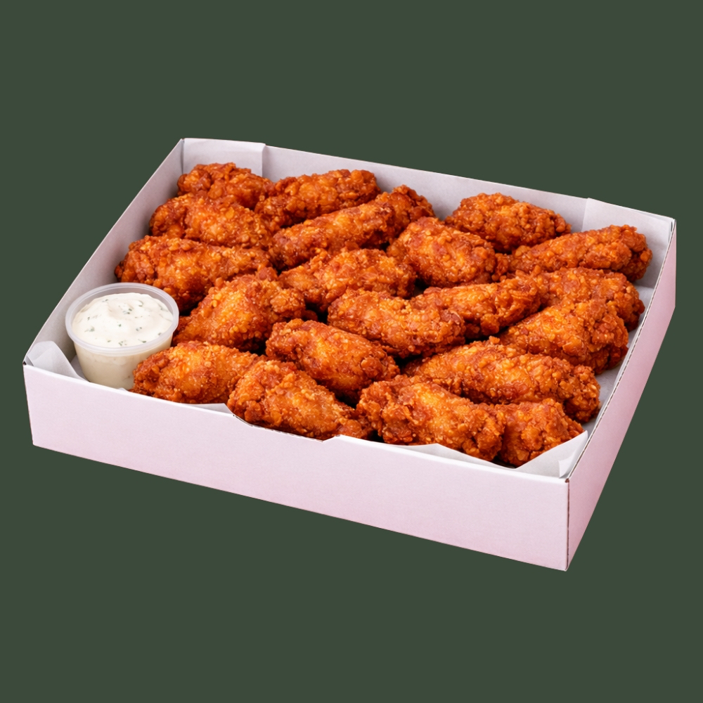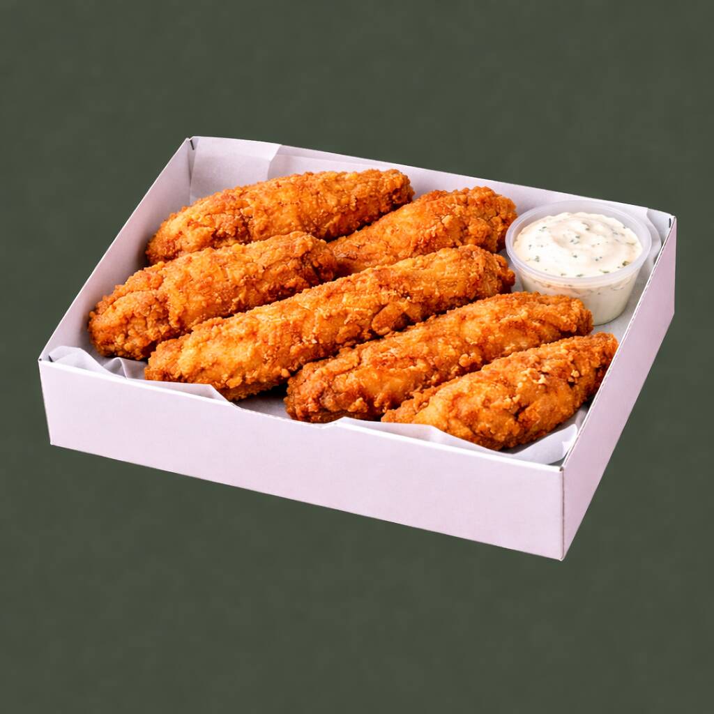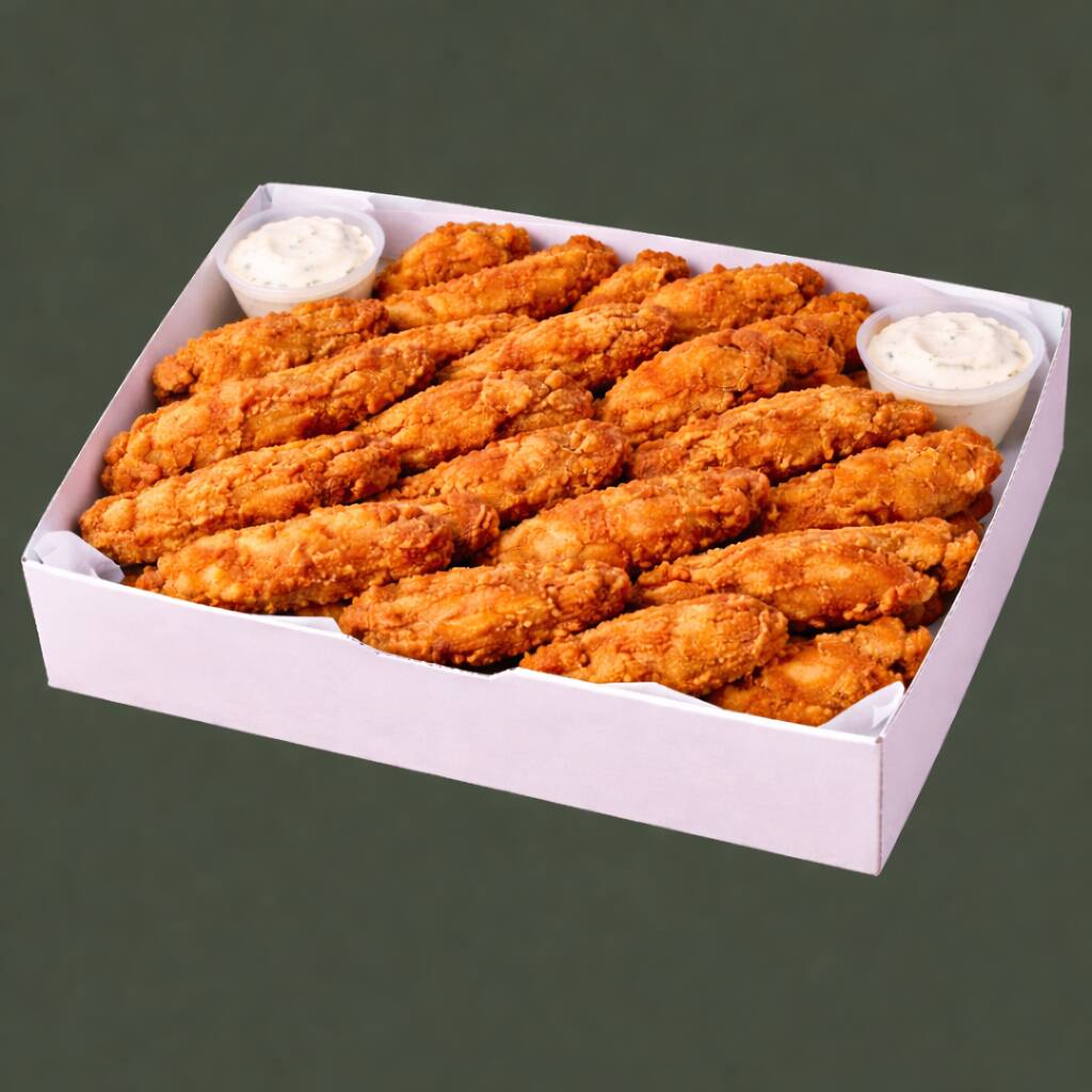 "Tenders grandes y jugosos con ese crunch que encanta. Trae dos salsas a elegir para que armes tu combinación favorita y disfrutes cada mordida al máximo. Incluye ranch para un dip súper crunchy. (Porción: 500 g/ 1 ranch)"