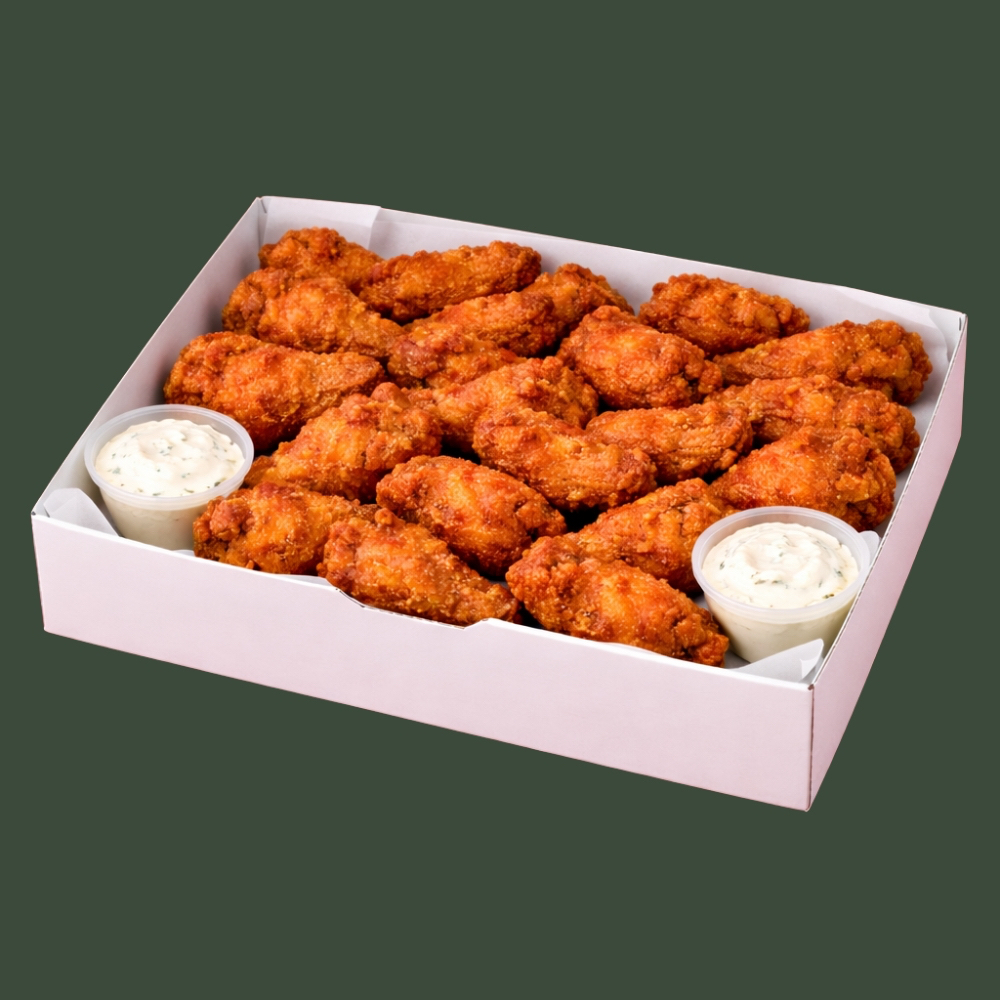"Treinta y seis alitas botaneras doraditas, crujientes y listas para una reunión padre. Con tres salsas a elegir, puedes armar combinaciones épicas llenas de crunch. El ranch no puede faltar para completar la experiencia. (Porción: 1 kg / 36 alitas/ 2 ranch)"