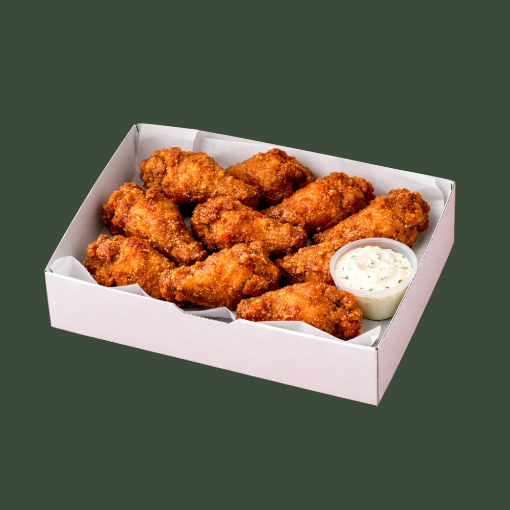 "Nueve alitas botaneras bien doraditas, jugosas y con un crunch que se disfruta desde el primer bocado. Elige tu salsa favorita y acompáñalas con su ranch para un dip padre y crujiente. (Porción: 250 g / 9 alitas/ 1 ranch)"